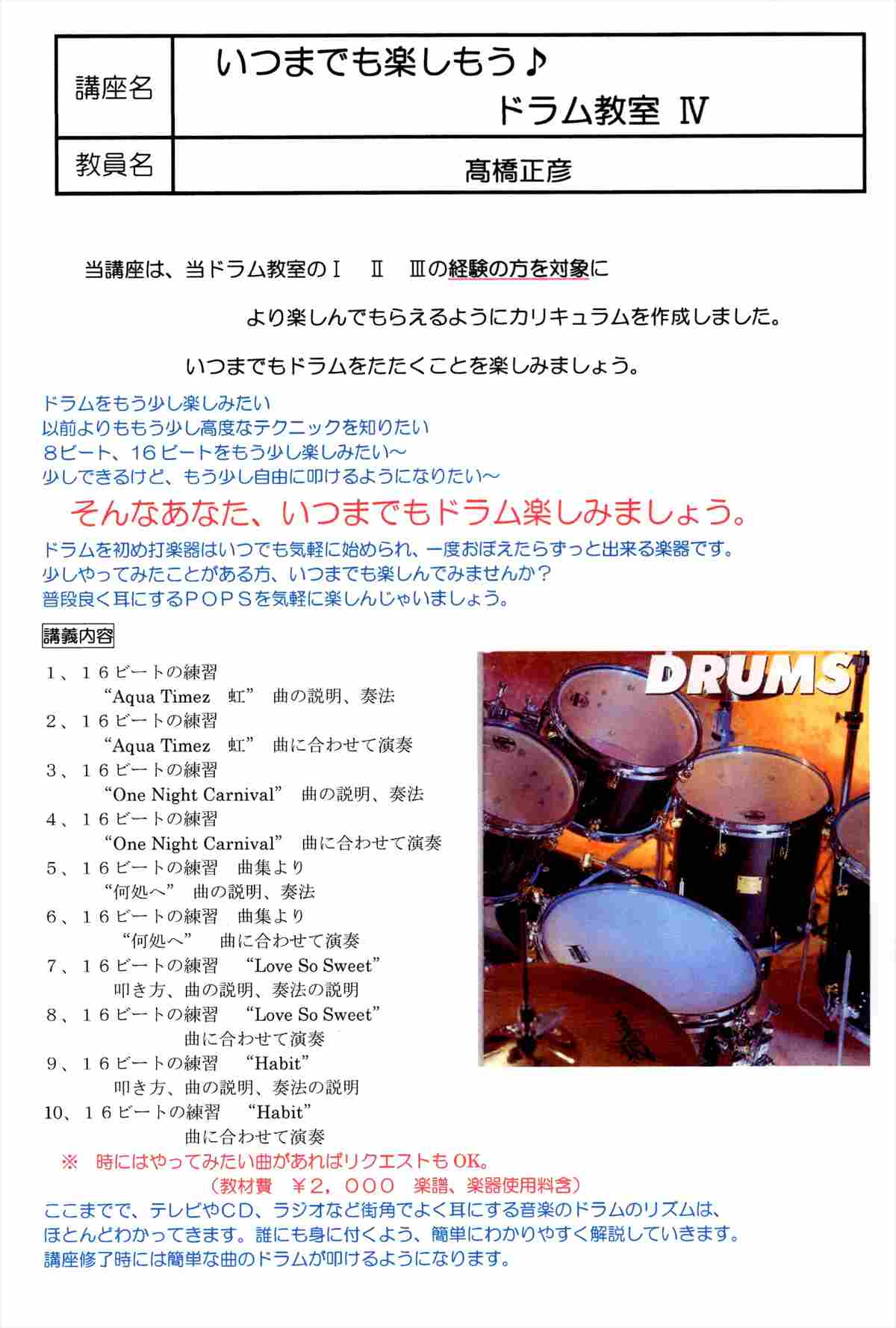 | 78 | いつまでも楽しもう ドラム教室Ⅳ | 髙橋正彦 | 4/10・4/24・5/8・5/22・6/12・6/26・7/10・7/24・8/28・9/11 | 金 | 19:00~20:30 | 上公 | 10 | BC | ¥2,000 | 10 |