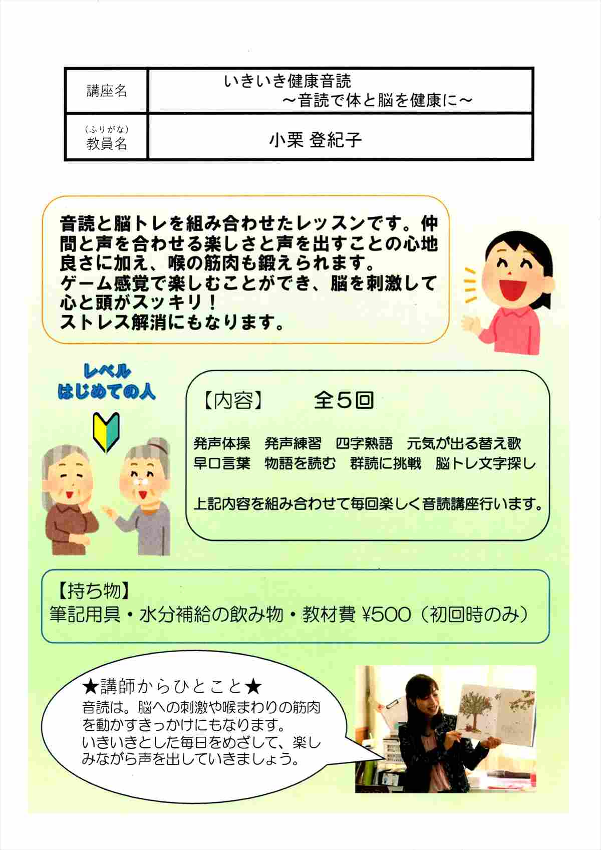 | 79 | いきいき健康音読~音読で体と脳を健康に~ | 小栗登紀子 | 4/7・5/12・6/2・7/7・9/1 | 火 | 10:15~11:45 | 芸劇 | 5 | A | ¥500 | 20 |