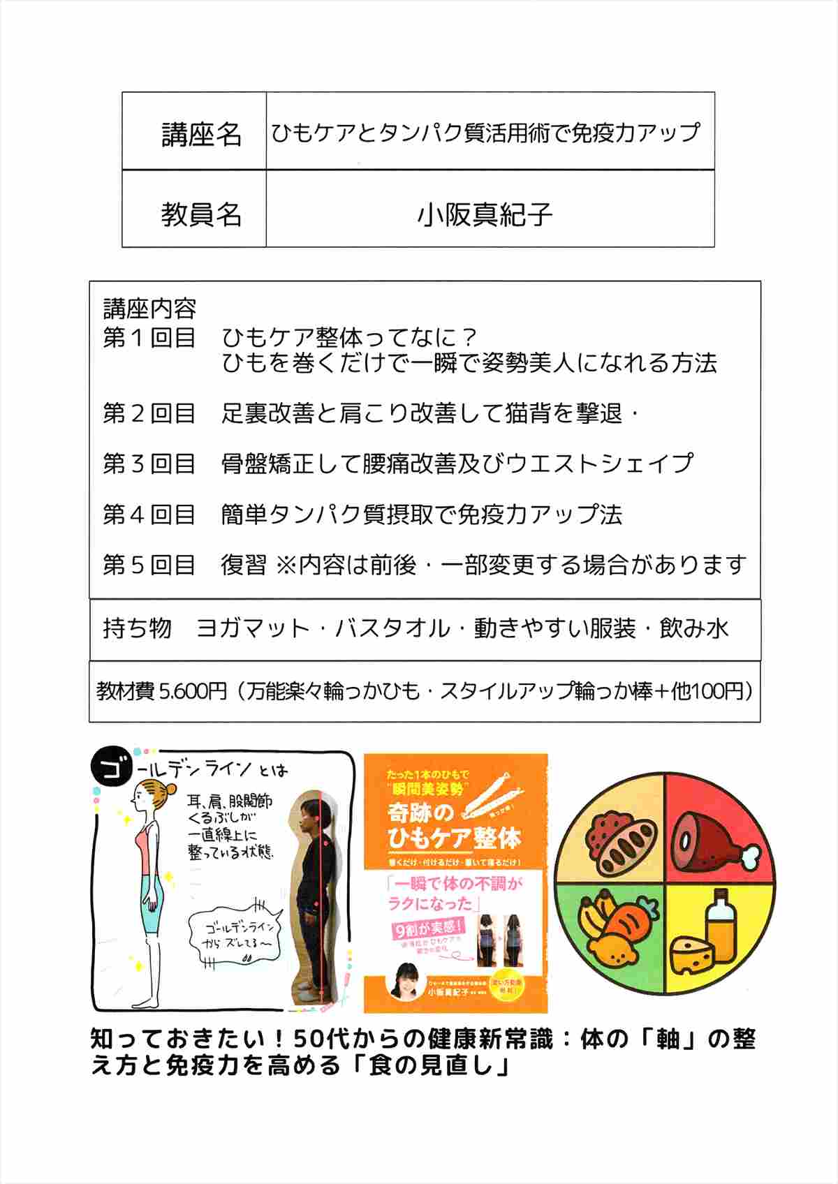 | 80 | ひもケアとタンパク質活用術で免疫力アップ | 小阪真紀子 | 4/23・5/28・6/25・7/23・8/27 | 木 | 10:30~12:00 | し村 | 5 | AB | ¥5,600 | 20 |