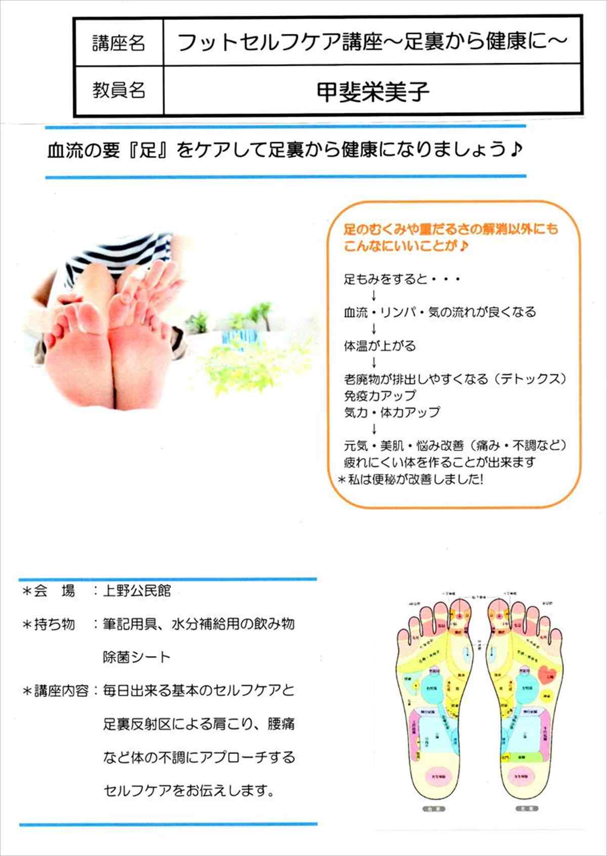 | 81 | フットセルフケア講座~足裏から健康に~ | 甲斐栄美子 | 4/28・5/26・6/23・7/28・8/25 | 火 | 10:00~11:30 | 上公 | 5 | ABC | ¥100 | 20 |