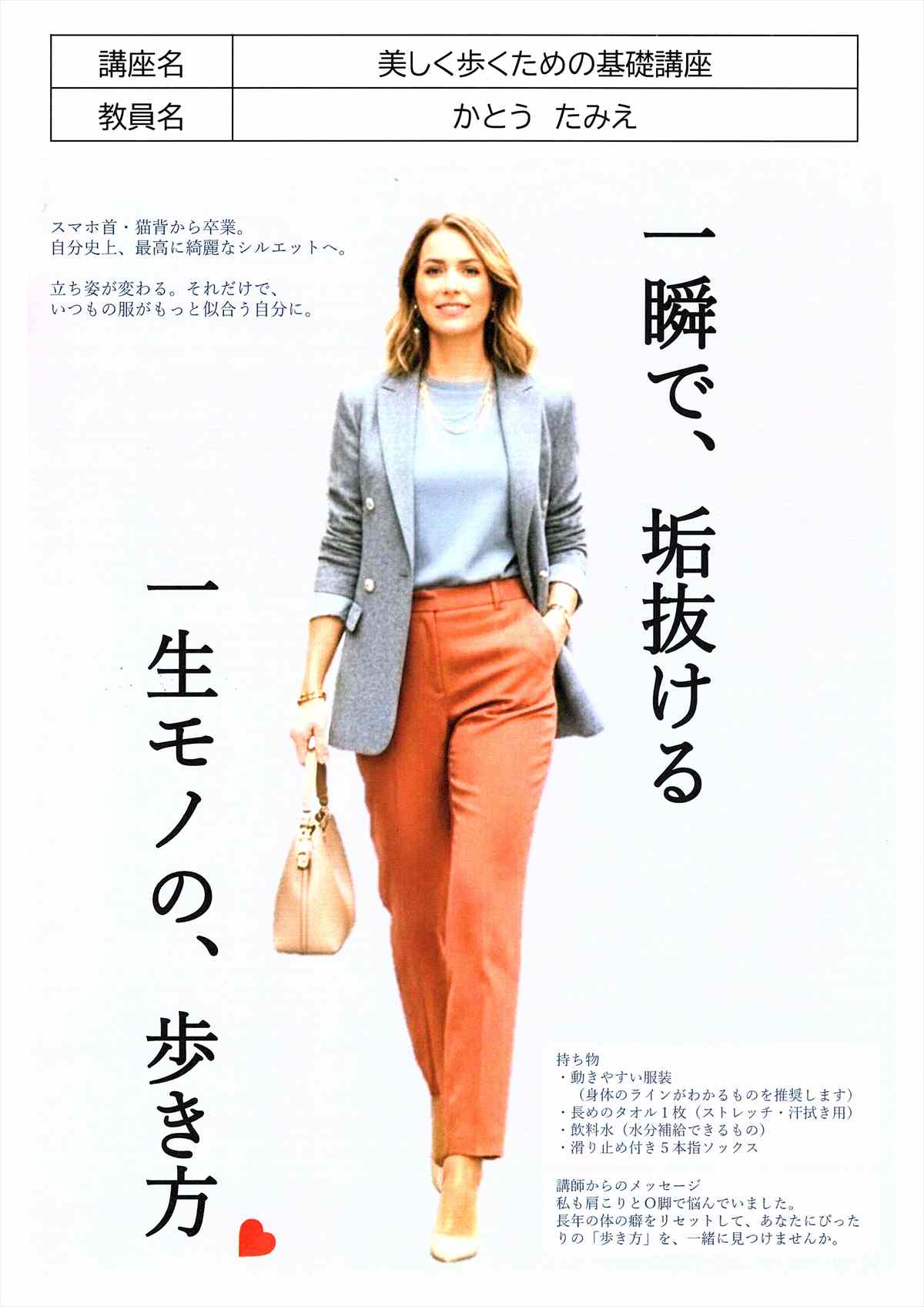 | 82 | 美しく歩くための基礎講座 | かとうたみえ | 4/8・4/22・5/13・5/27・6/10・6/24・7/8・7/22・8/26・9/9 | 水 | 19:00~20:30 | 上公 | 10 | A | ¥0 | 10 |