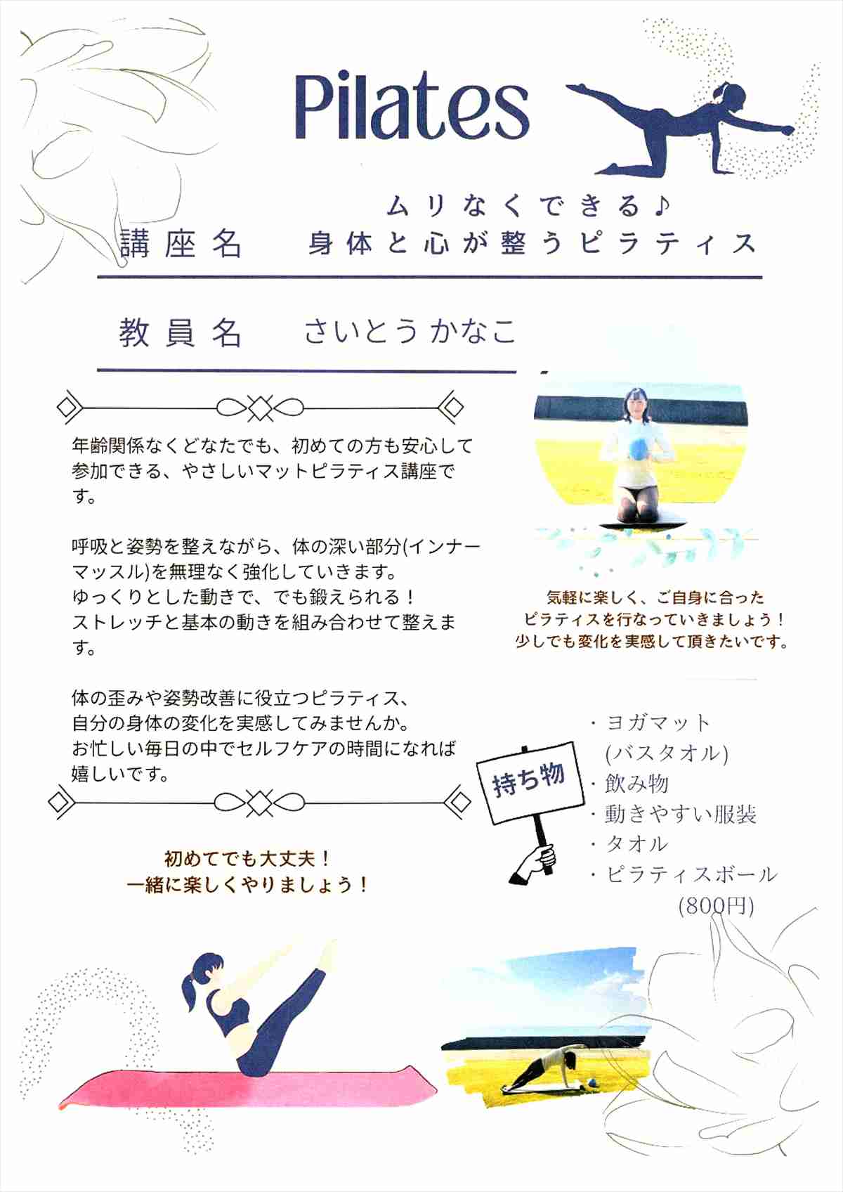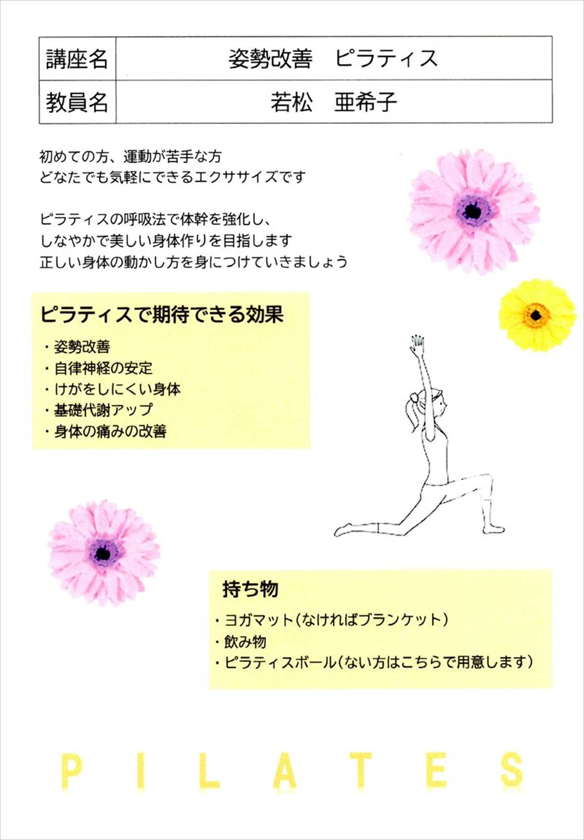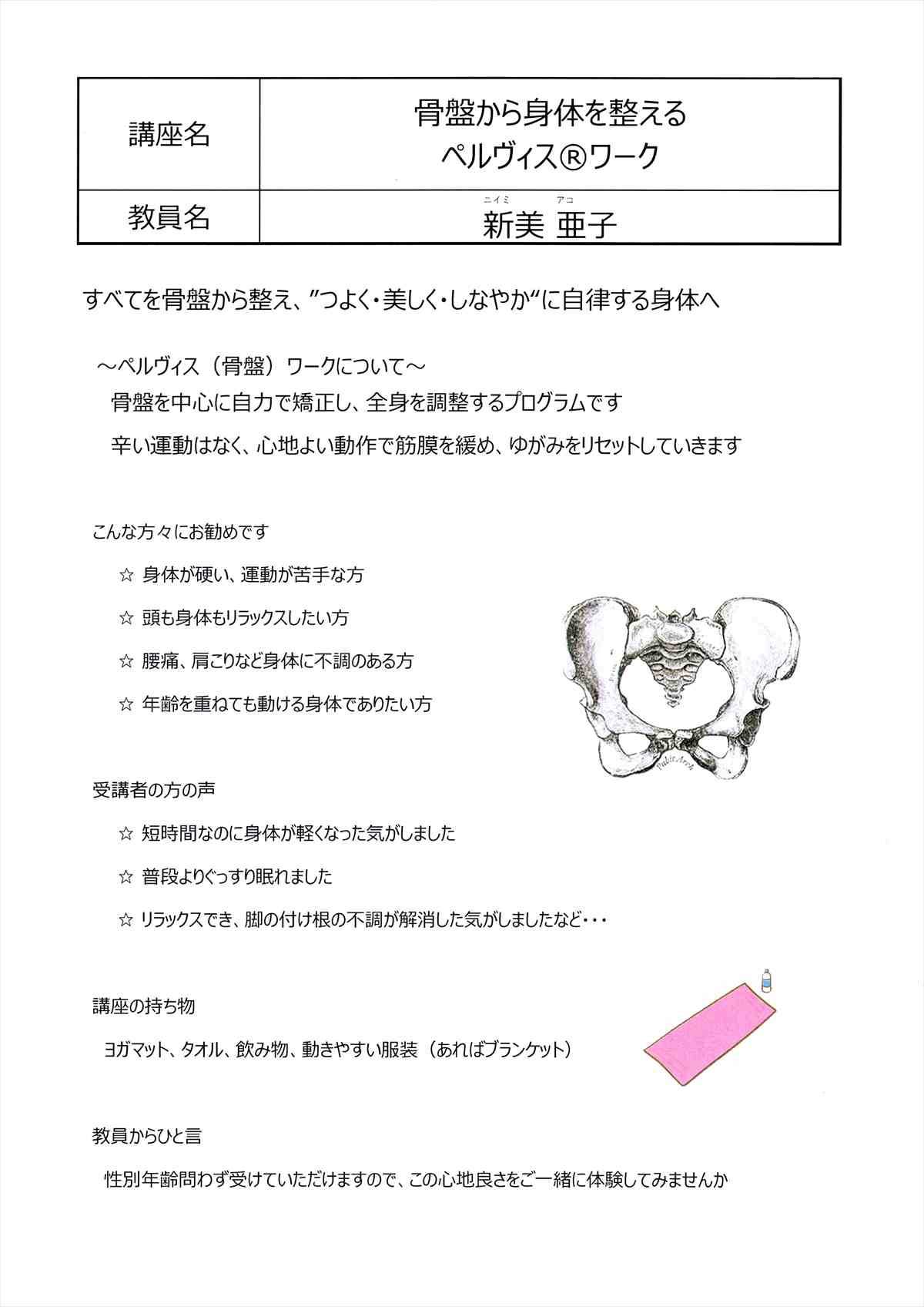 | 83 | ペルヴィス🄬ワーク(骨盤を中心に身体を整える) | 新美亜子 | 4/26・5/24・6/28・7/26・8/23 | 日 | 10:00~11:30 | 上公 | 5 | A | ¥0 | 15 |