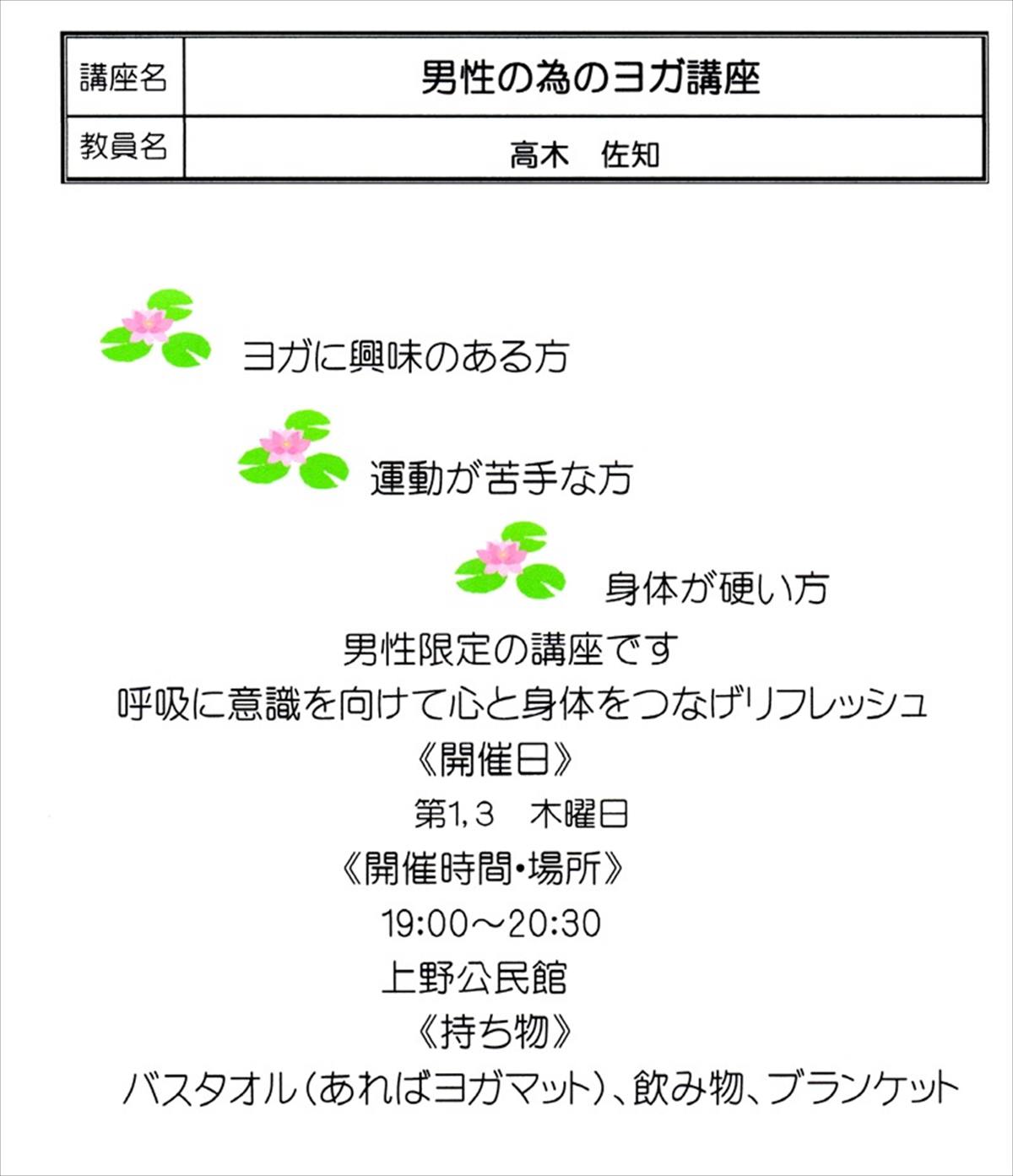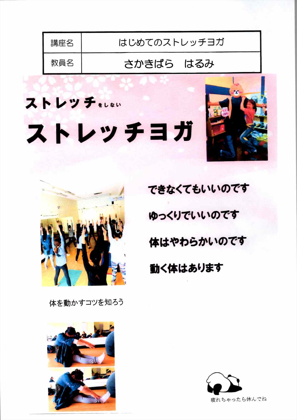 | 84 | はじめてのストレッチヨガ | さかきばらはるみ | 4/15・5/20・6/17・7/15・8/19 | 水 | 10:00~11:30 | 上公 | 5 | ABC | ¥0 | 20 |