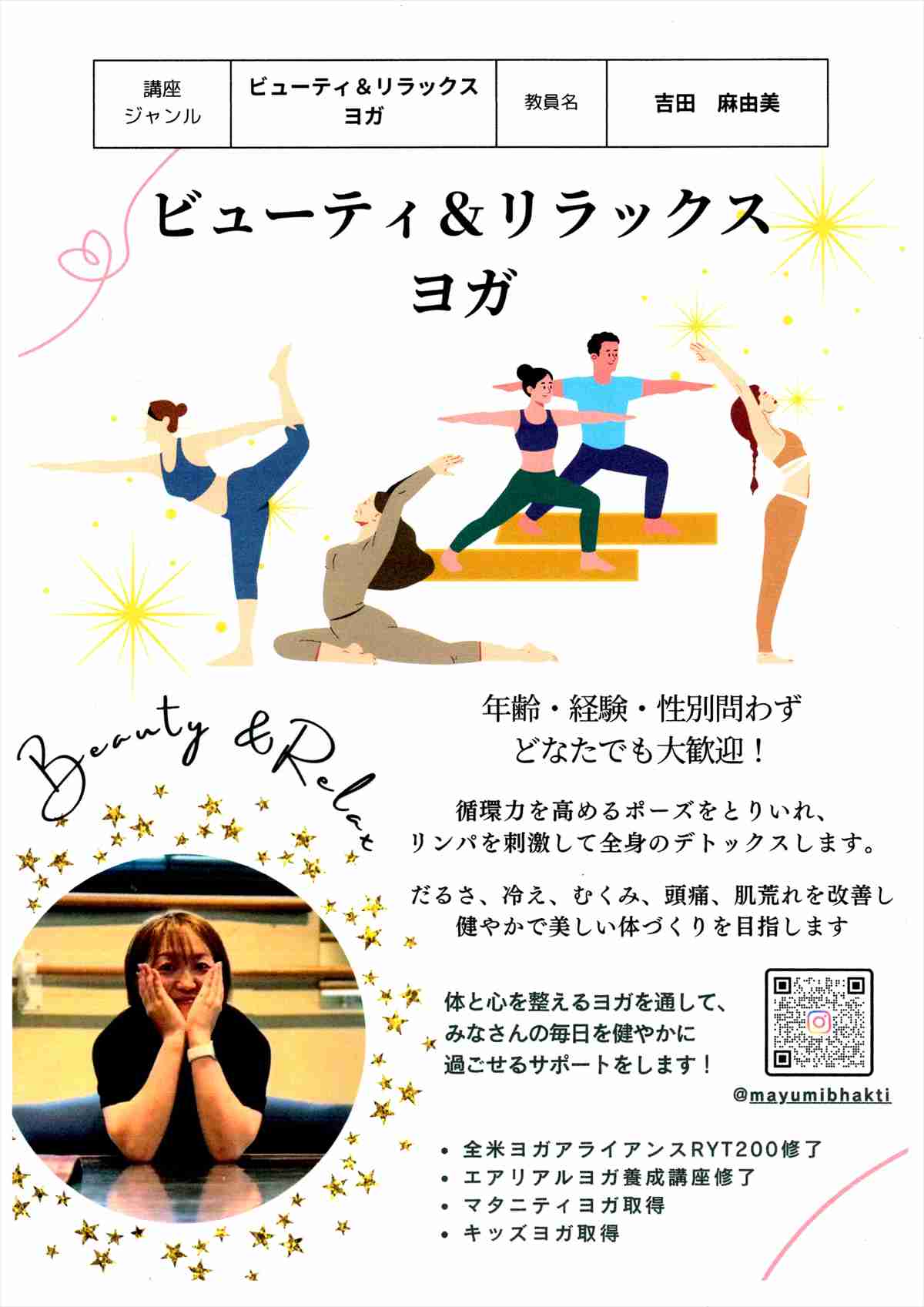 | 85 | ビューティー&リラックスヨガ | 吉田麻由美 | 4/10・4/24・5/8・5/22・5/29・6/12・6/26・7/10・7/24・7/31 | 金 | 10:10~11:40 | 創杜 | 10 | ABC | ¥1,000 | 20 |