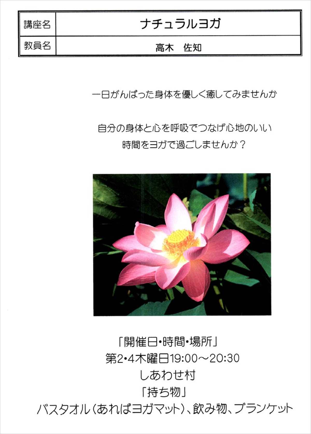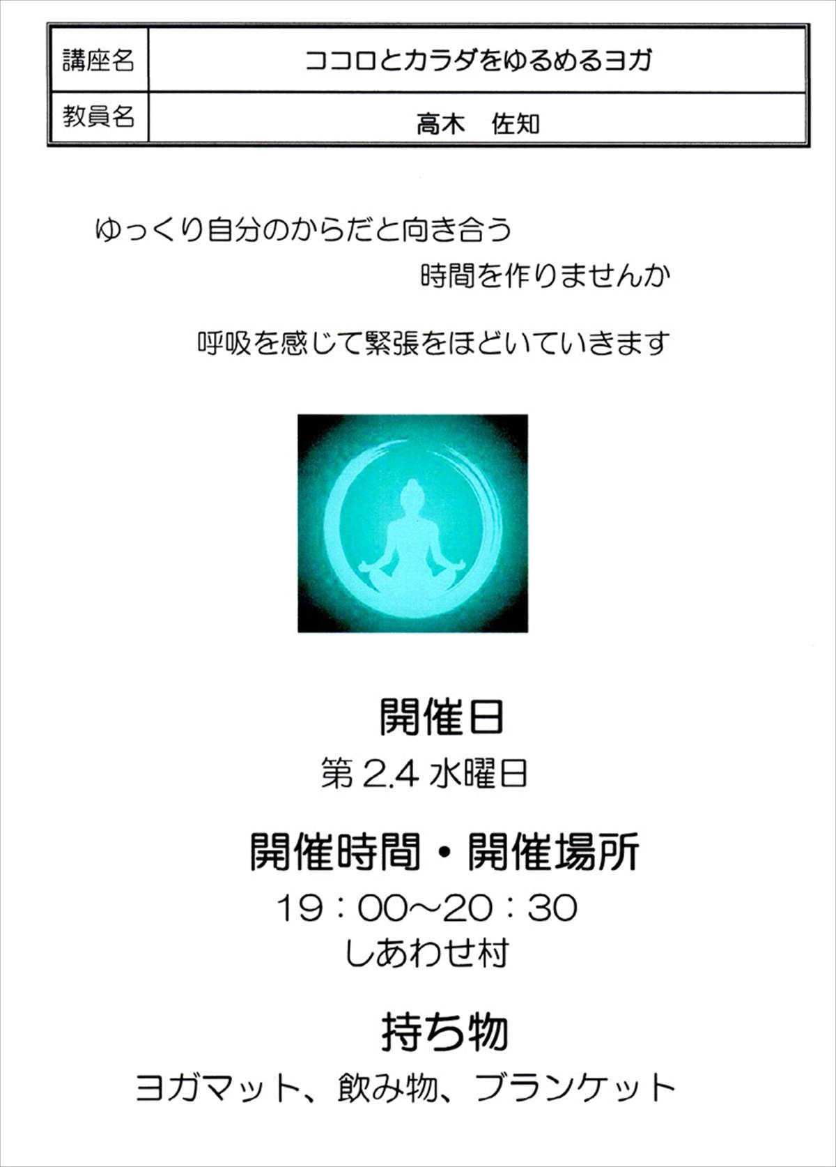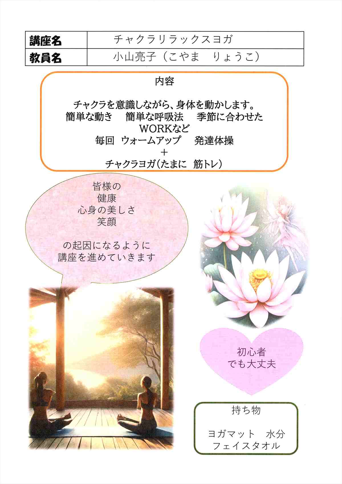 | 87 | チャクラリラックスヨガ | 小山亮子 | 4/16・5/21・6/4・6/18・7/2・7/16・7/30・8/6・8/20・9/3 | 木 | 10:00~11:30 | し村 | 10 | AB | ¥0 | 10 |