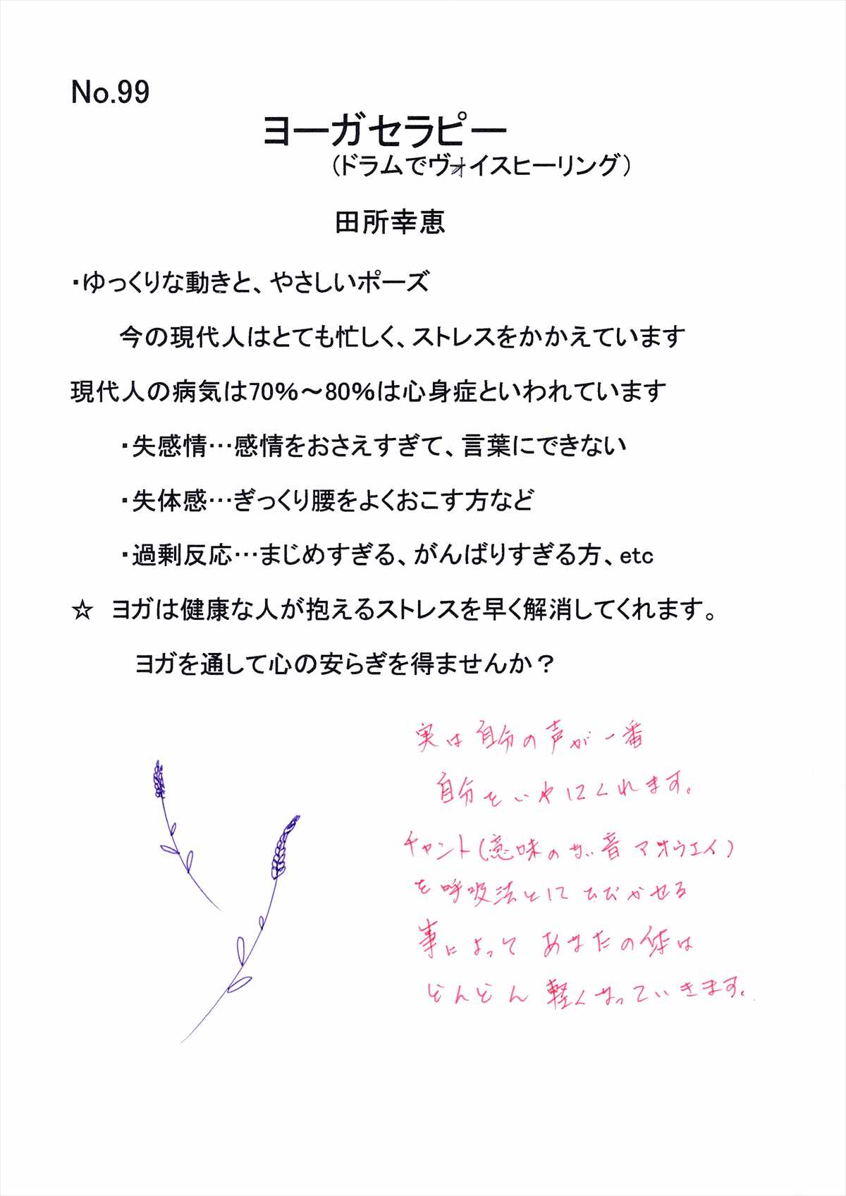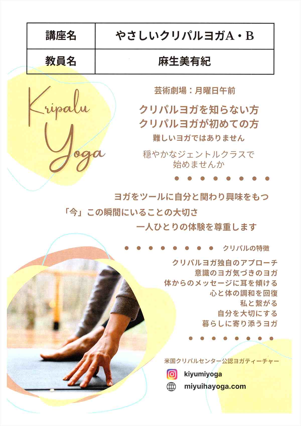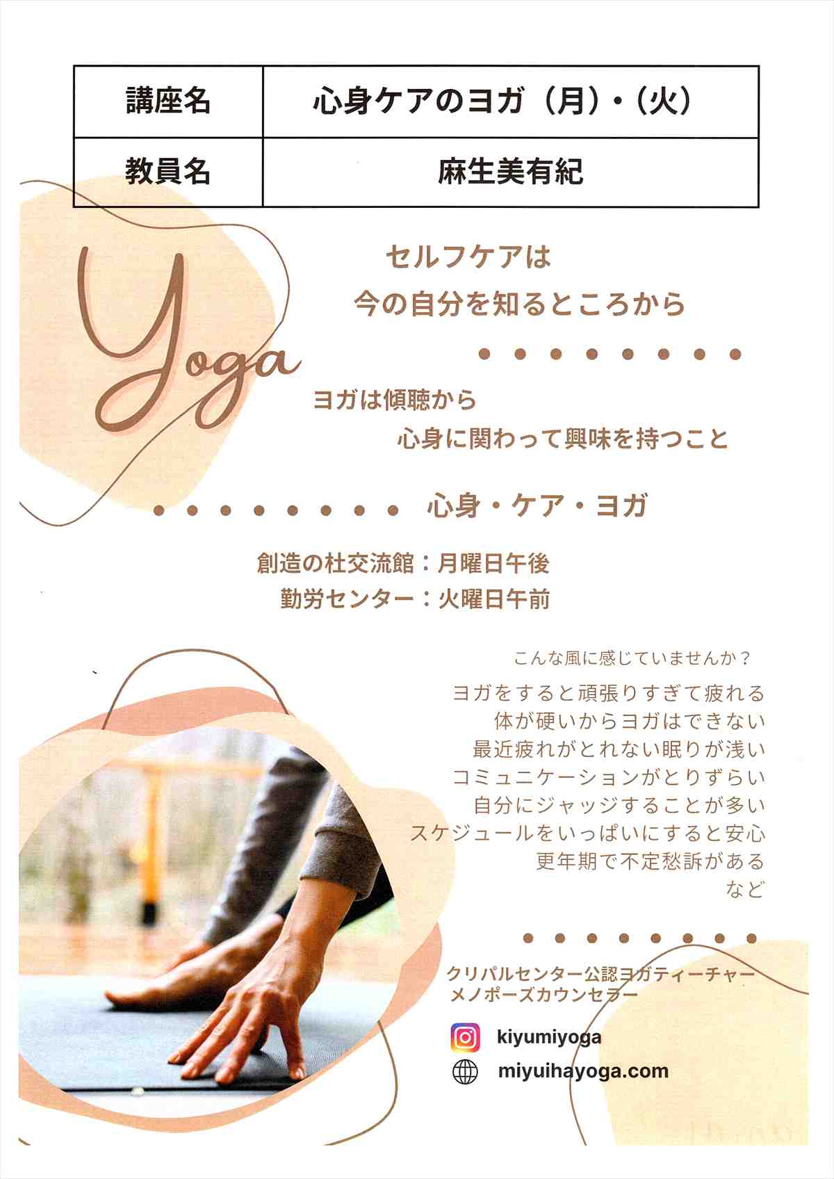 | 86 | 心と身体のデトックスヨガ | 吉田麻由美 | 5/8・5/22・5/29・6/12・6/26・7/10・7/24・8/28・9/11・9/25 | 金 | 19:10~20:40 | 創杜 | 10 | ABC | ¥1,000 | 20 |