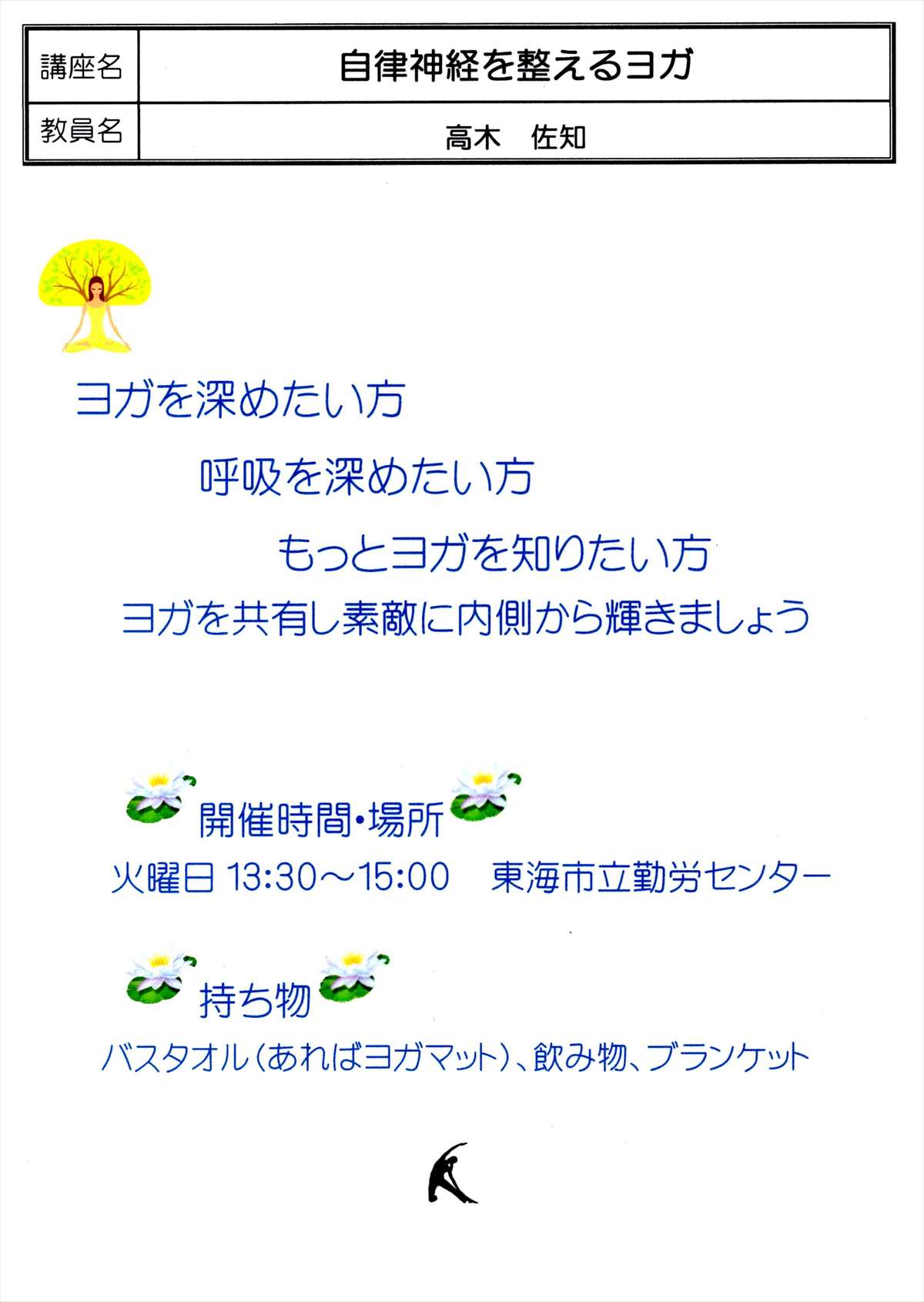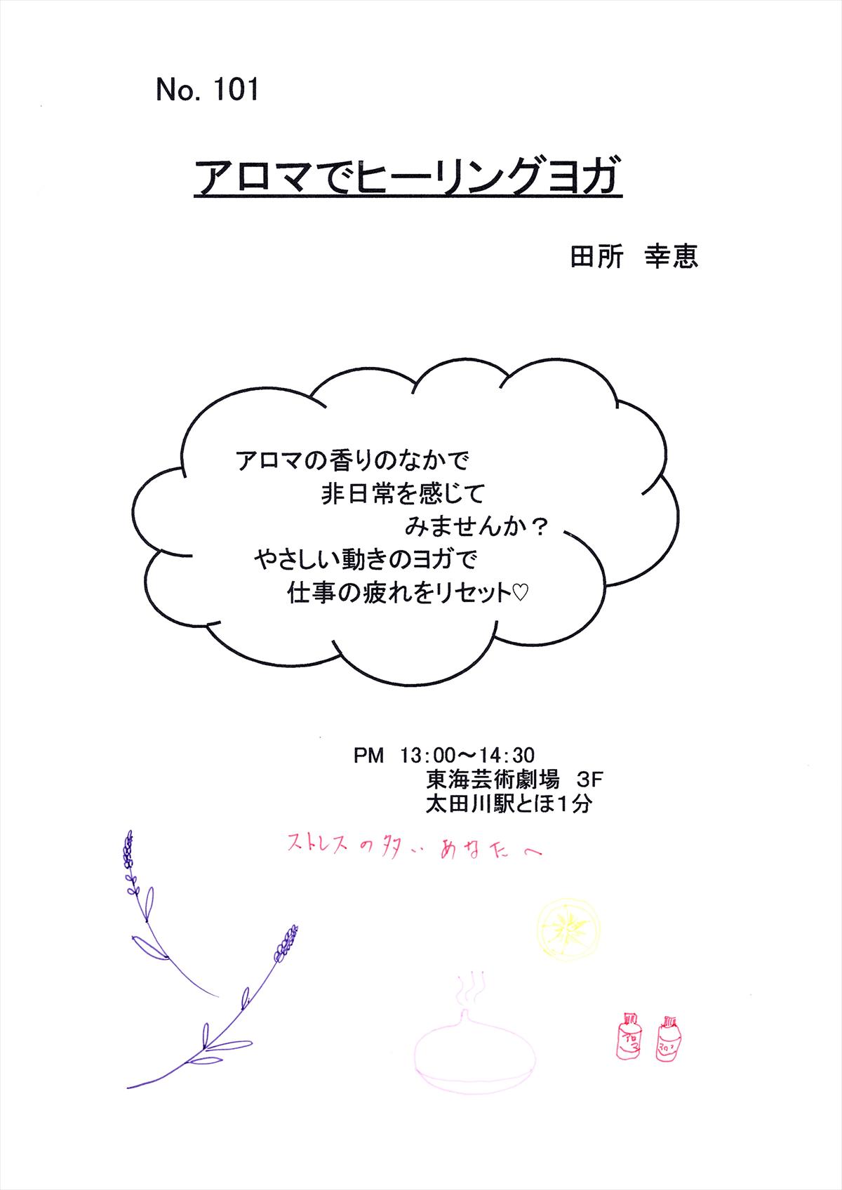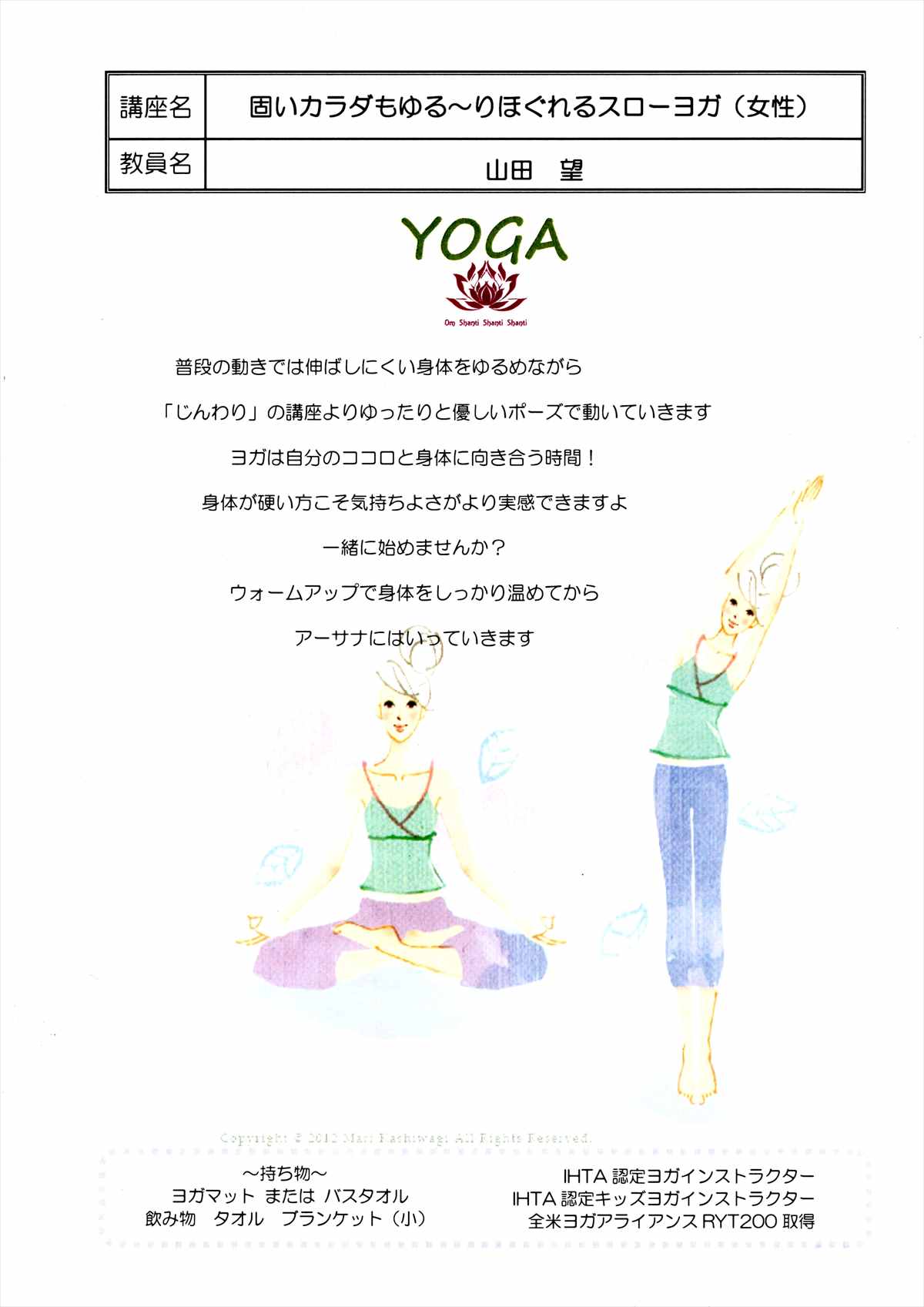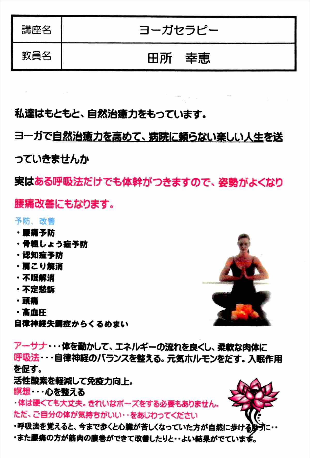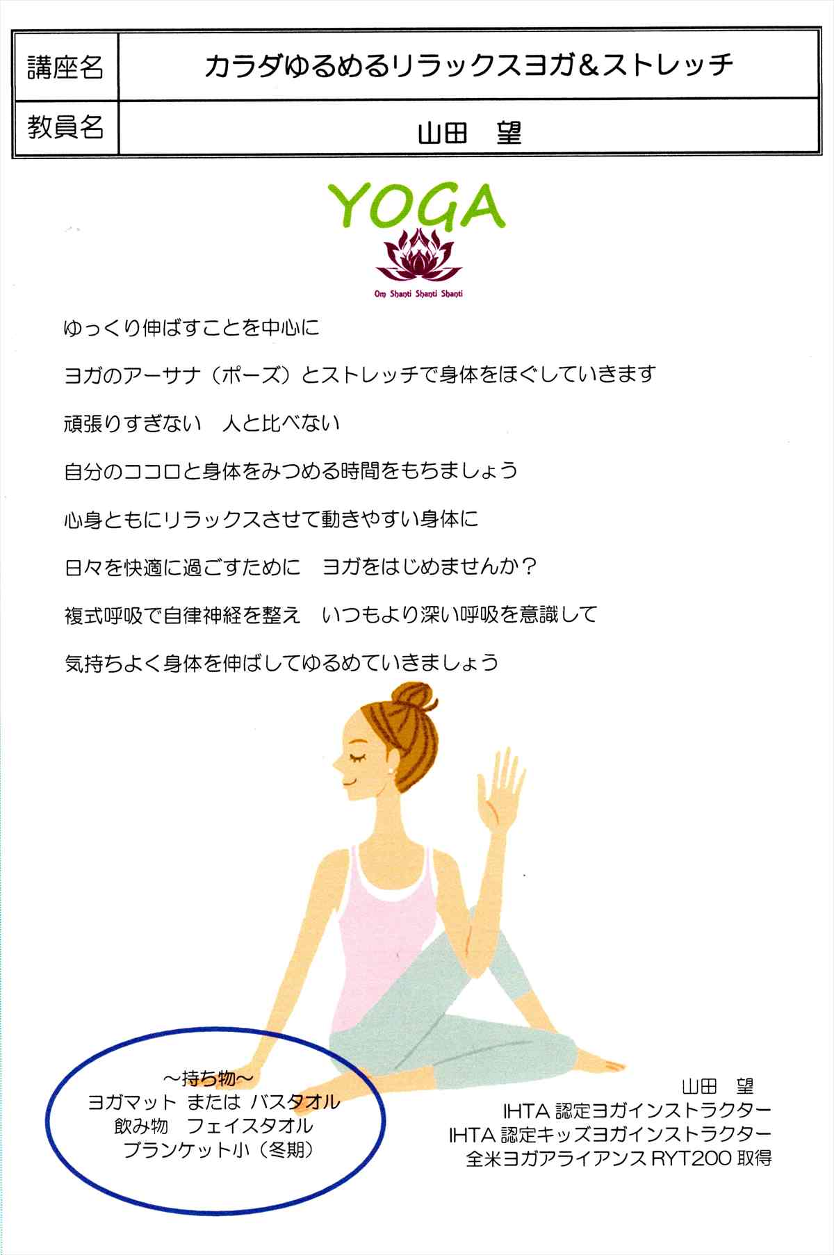 | 88 | やさしいアロマヨガA(女性) | 百瀬友香里 | 4/16・5/7・5/21・6/4・6/18・7/2・7/16・8/6・8/20・9/3 | 木 | 13:15~14:45 | し村 | 10 | ABC | ¥100 | 16 |