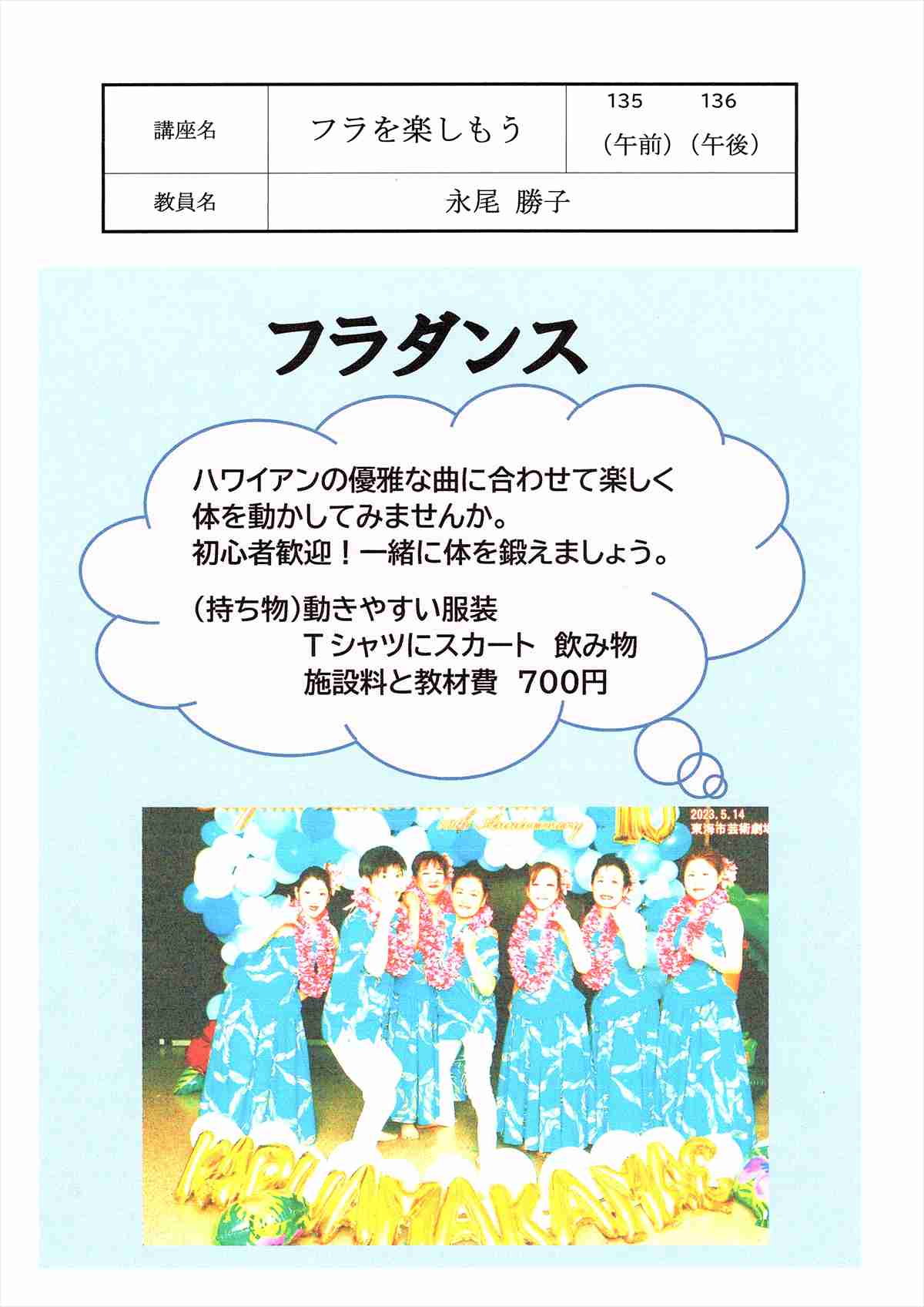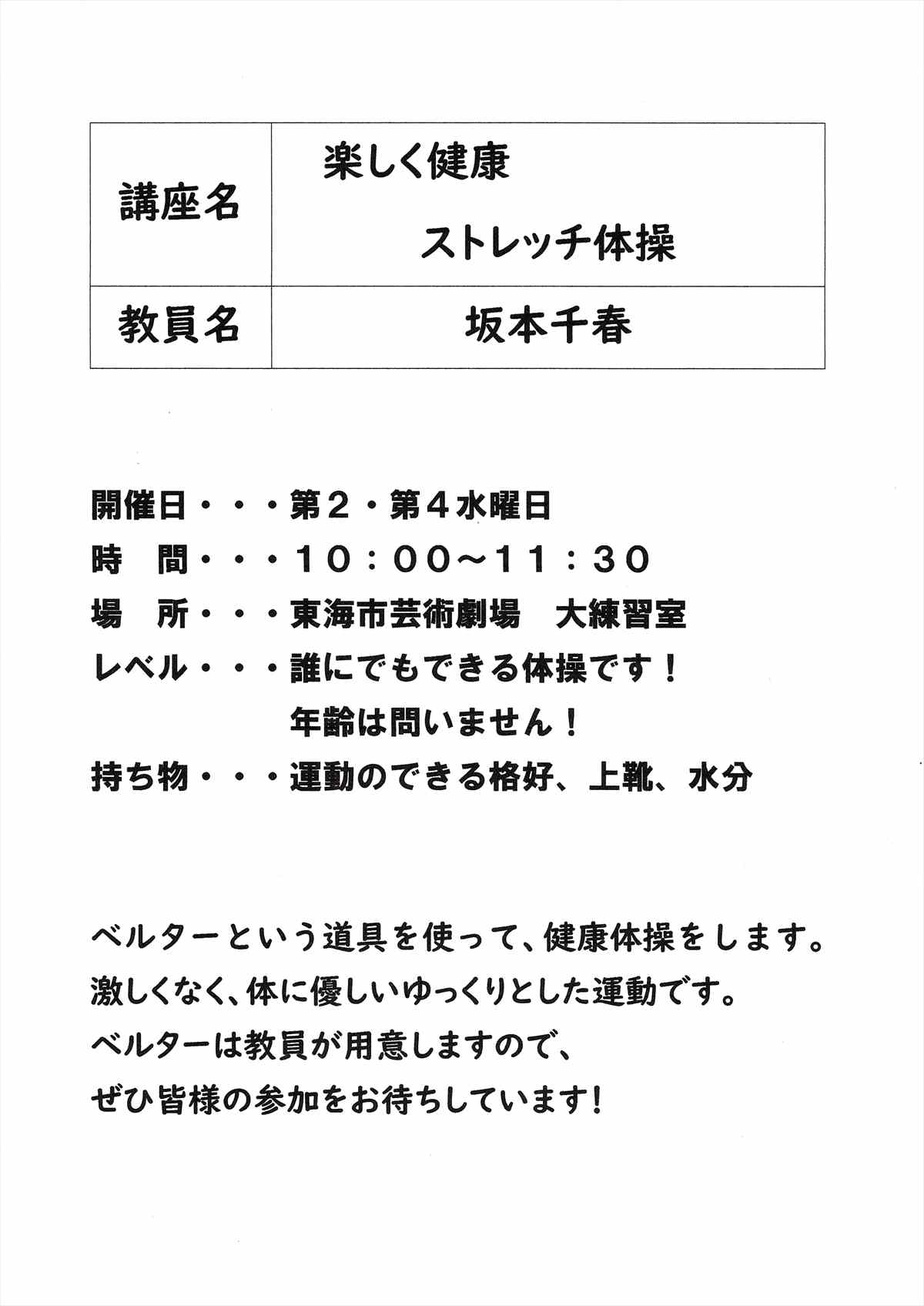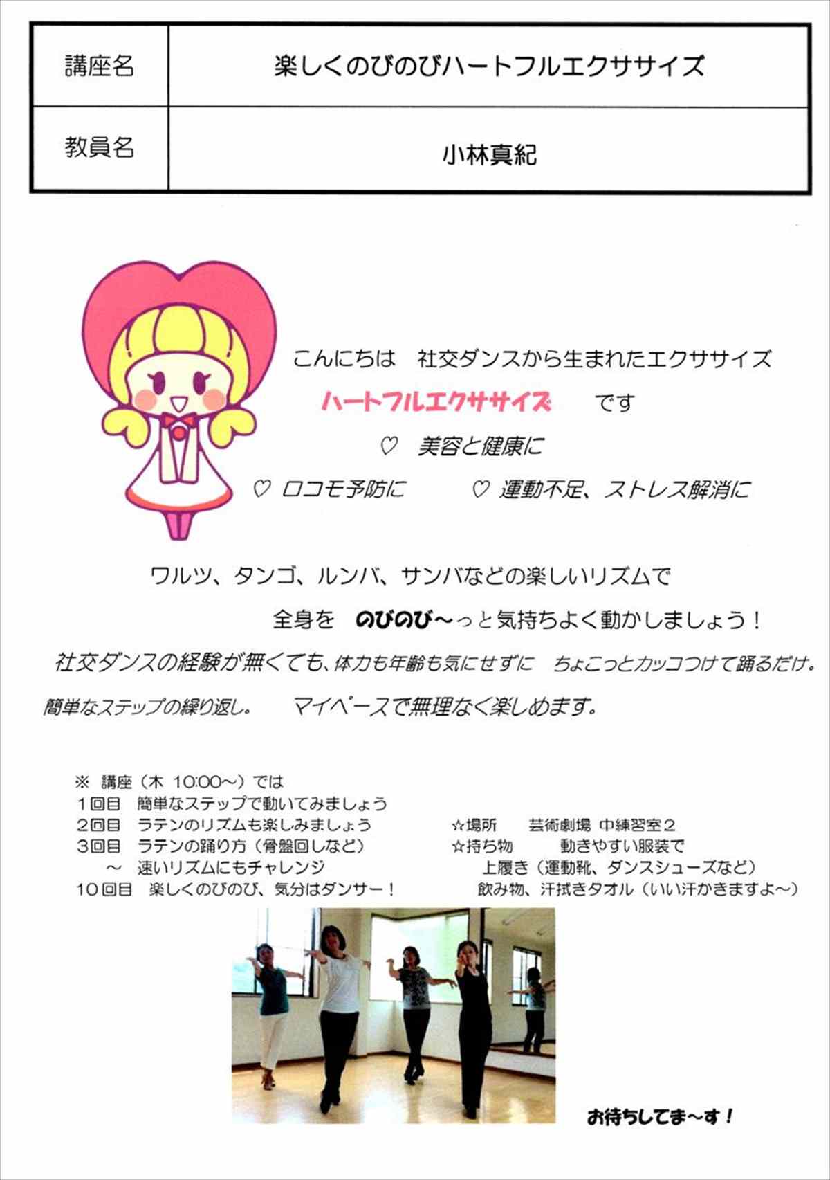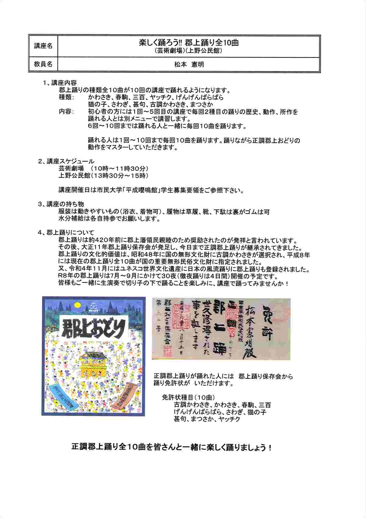 | 144 | 楽しく踊ろう!! 郡上おどり全10曲 (上公) | 松本憲明 | 4/14・4/28・5/12・5/26・6/9・6/23・7/14・7/28・9/8・9/29 | 火 | 13:30~15:00 | 上公 | 10 | ABC | ¥0 | 30 |