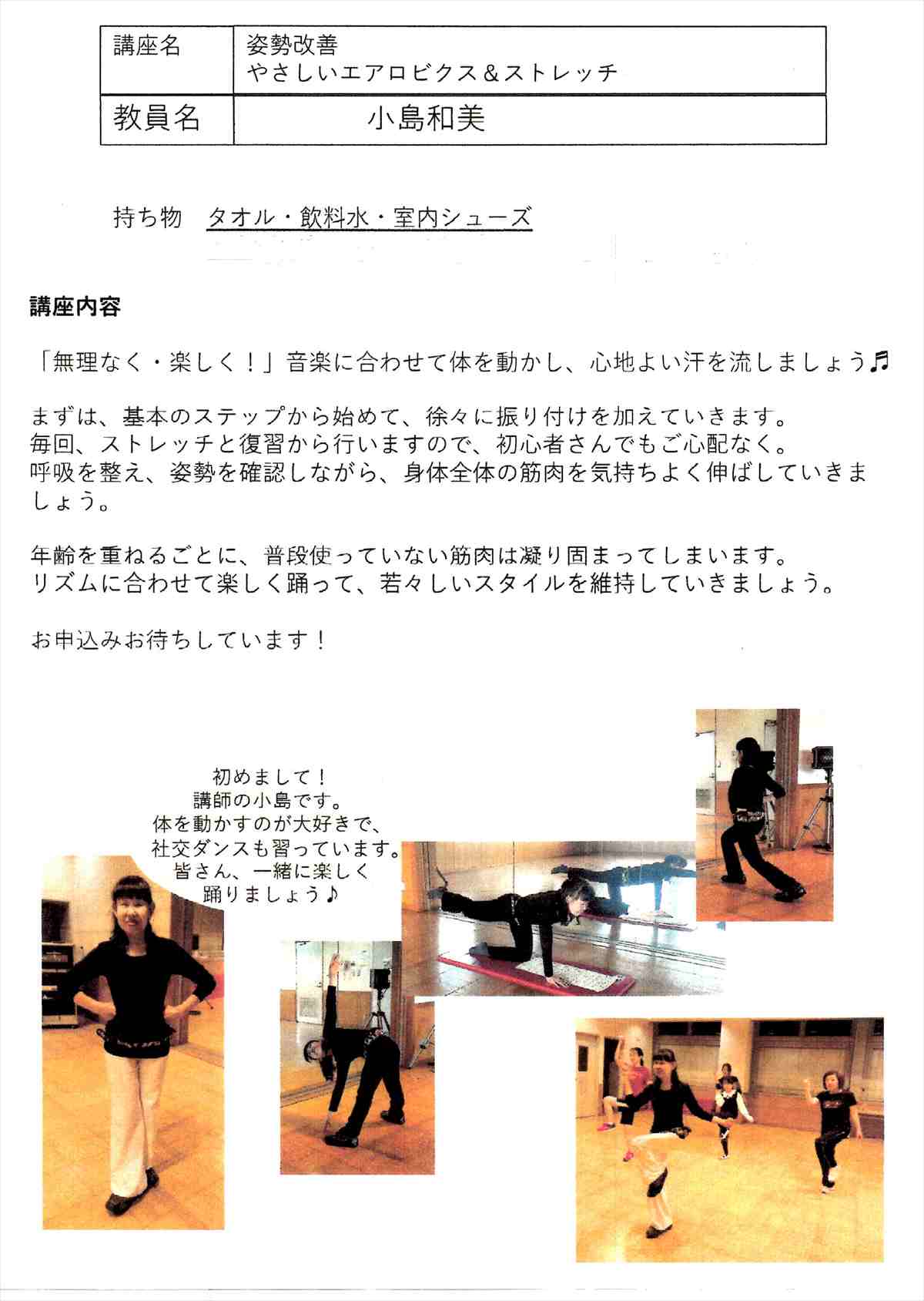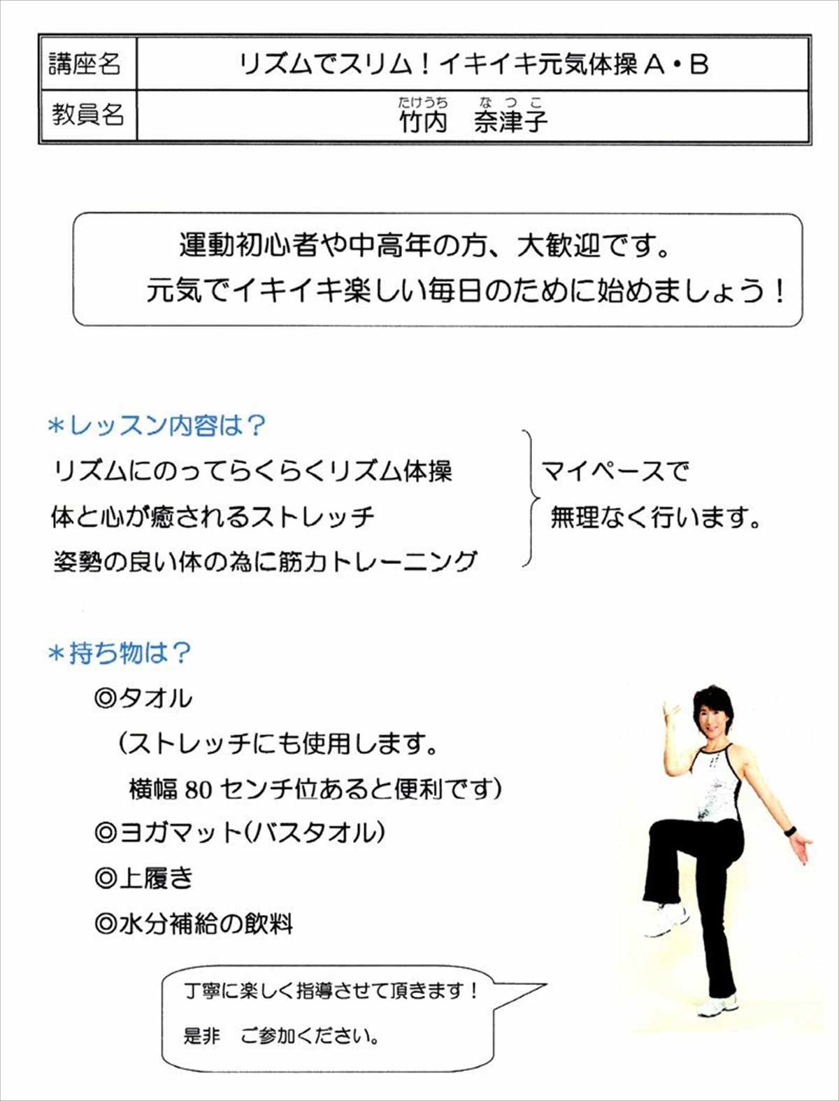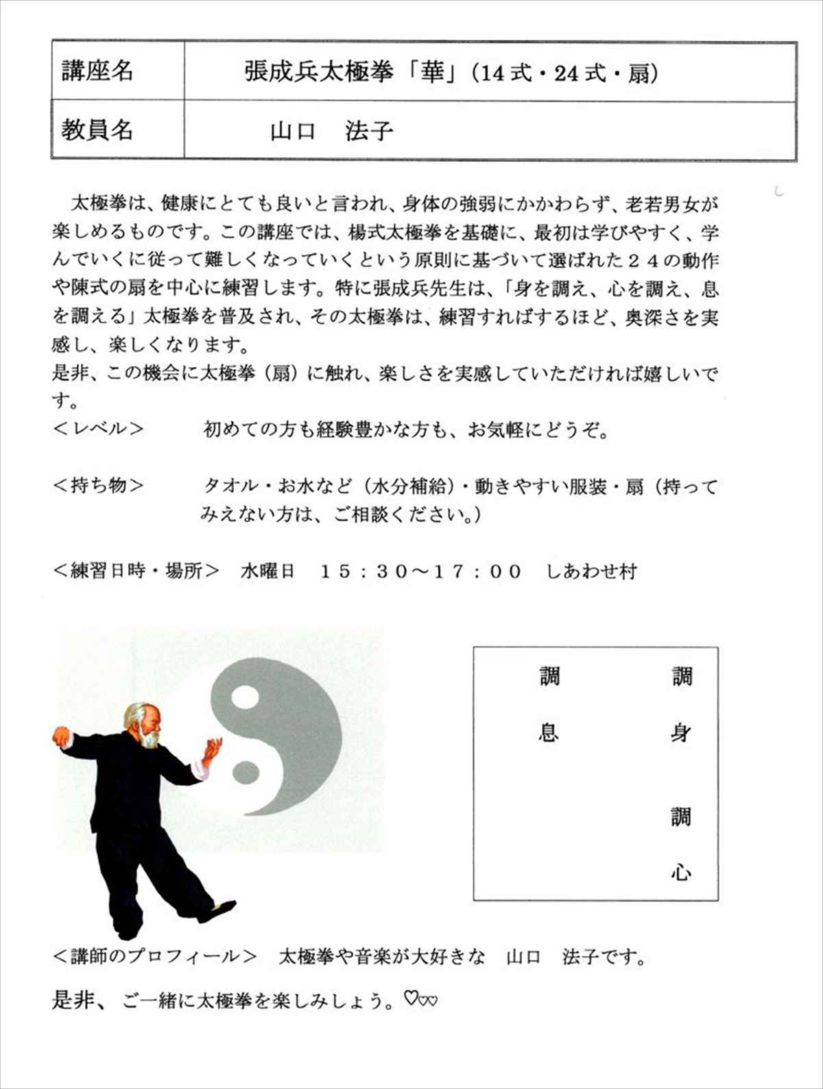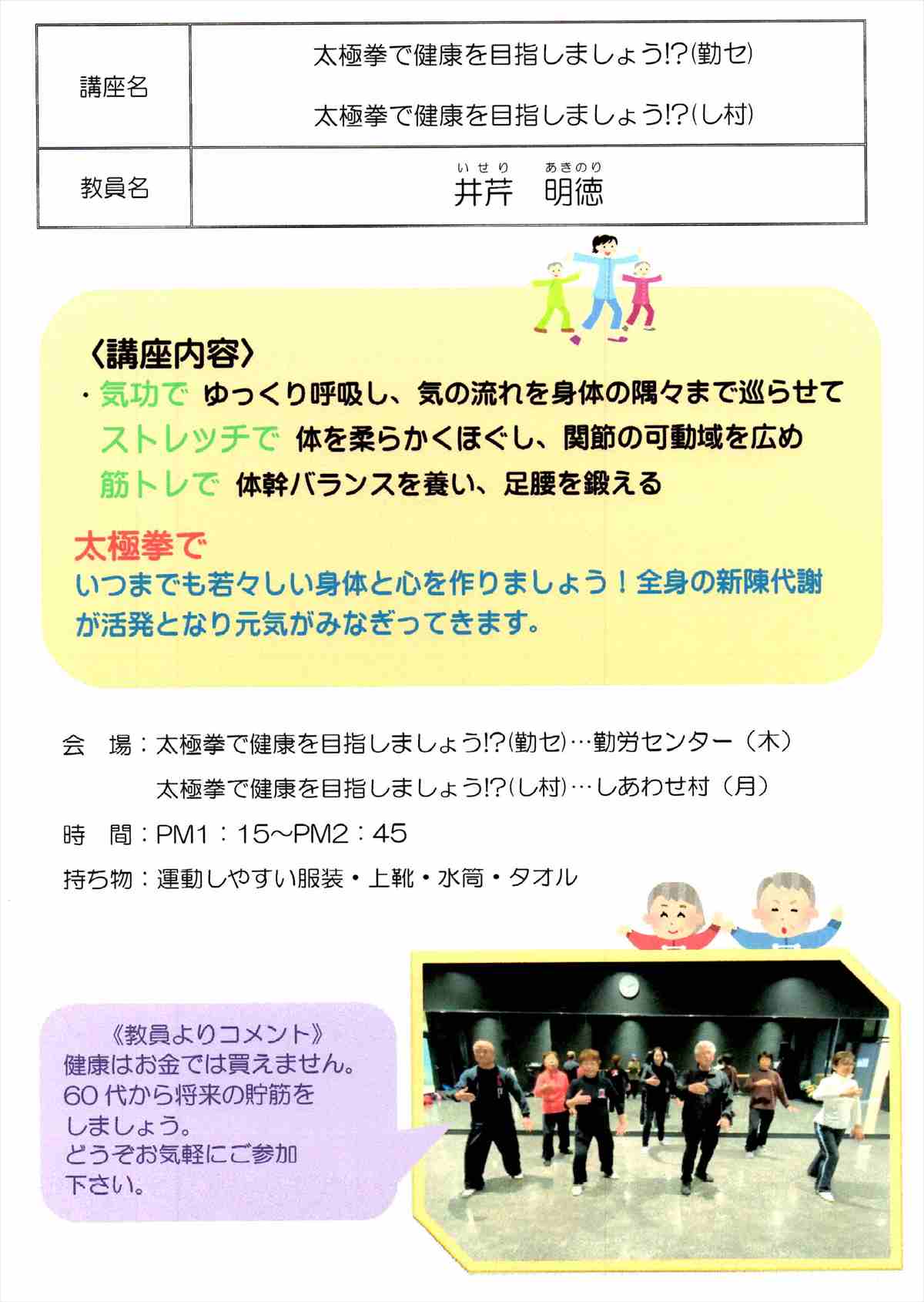 | 144 | 楽しく踊ろう!! 郡上おどり全10曲 (上公) | 松本憲明 | 4/14・4/28・5/12・5/26・6/9・6/23・7/14・7/28・9/8・9/29 | 火 | 13:30~15:00 | 上公 | 10 | ABC | ¥0 | 30 |