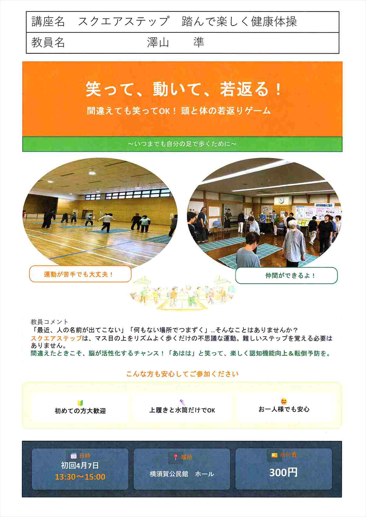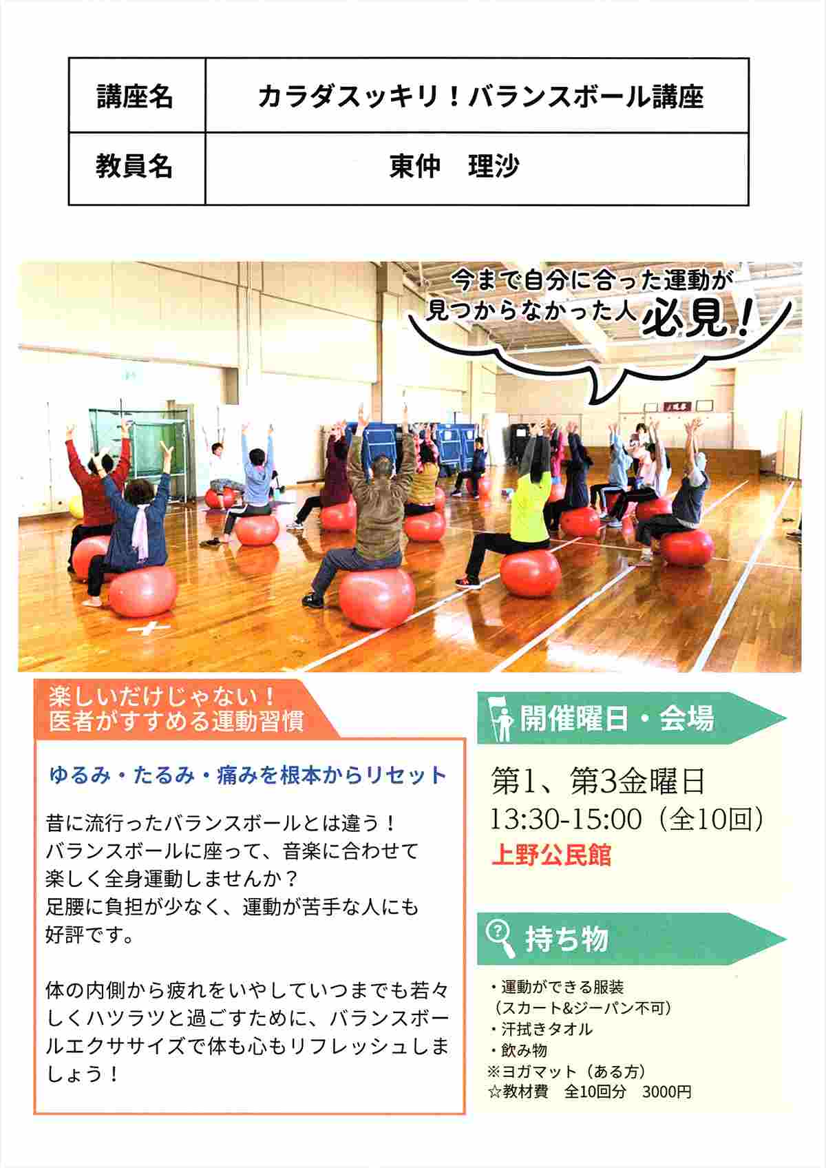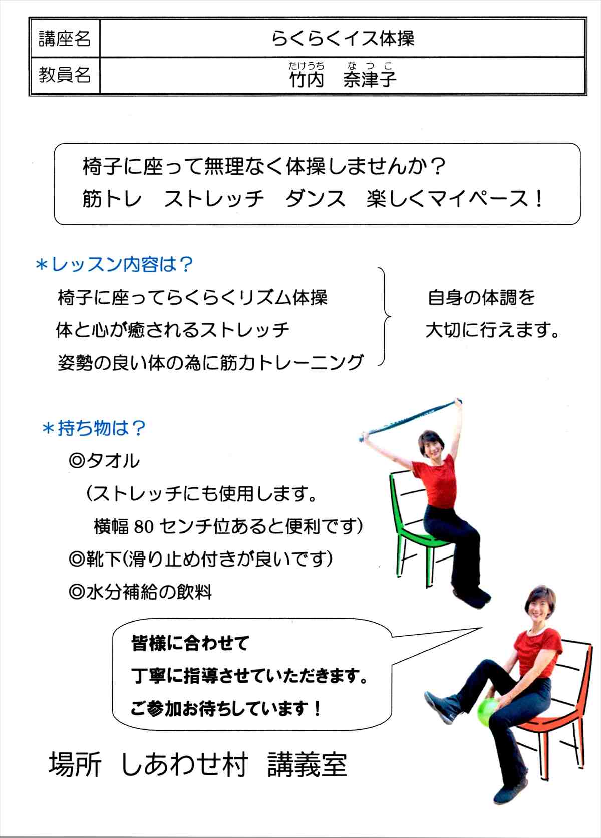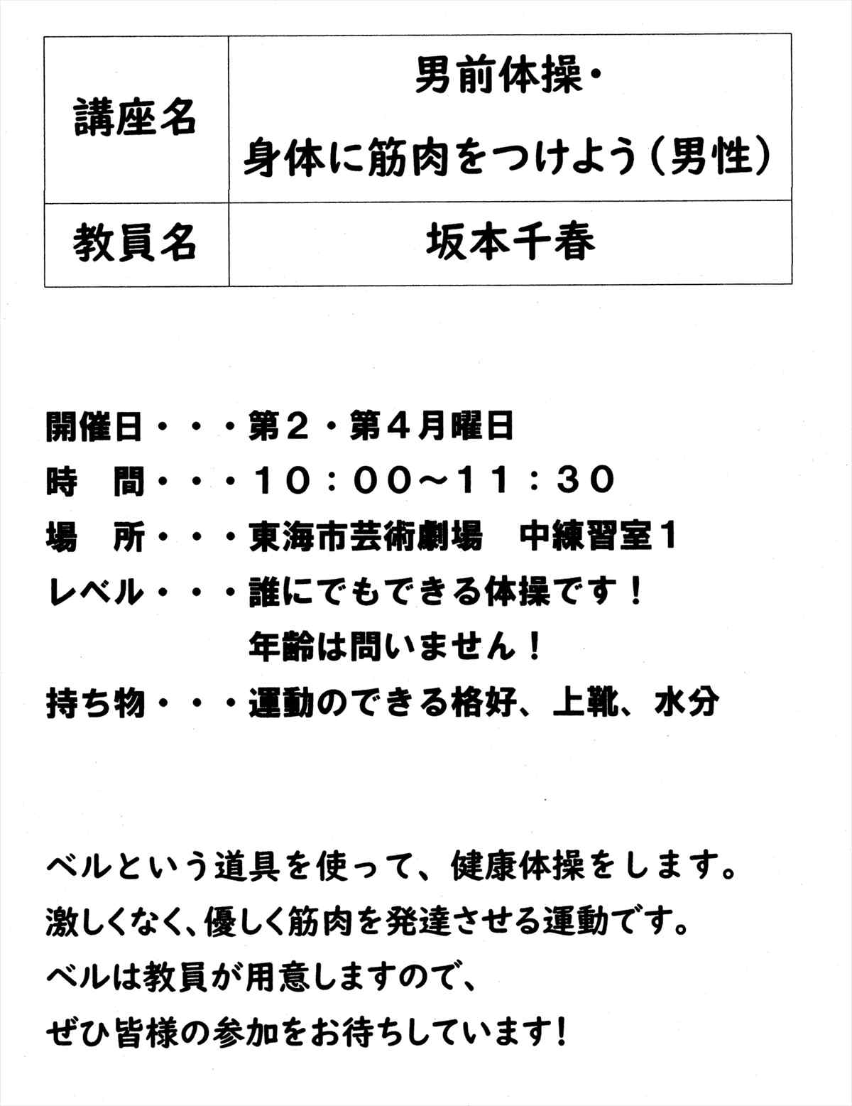 | 144 | 楽しく踊ろう!! 郡上おどり全10曲 (上公) | 松本憲明 | 4/14・4/28・5/12・5/26・6/9・6/23・7/14・7/28・9/8・9/29 | 火 | 13:30~15:00 | 上公 | 10 | ABC | ¥0 | 30 |