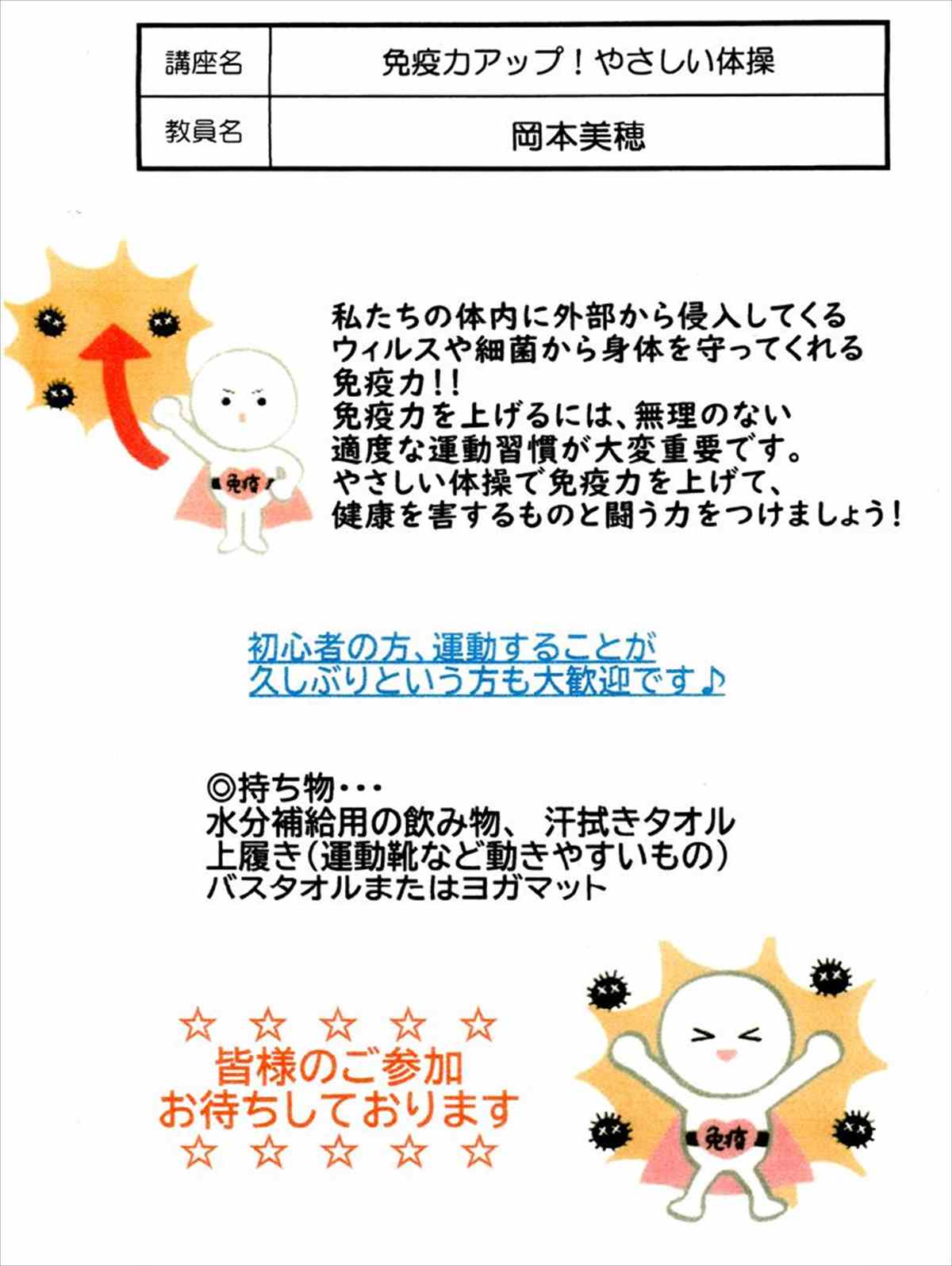 4/16・4/30・5/21・6/4・6/18・7/2・7/16・7/30・8/27・9/10 | 木 | 13:30~15:00 | 上公 | 10 | C | ¥500 | 20 |