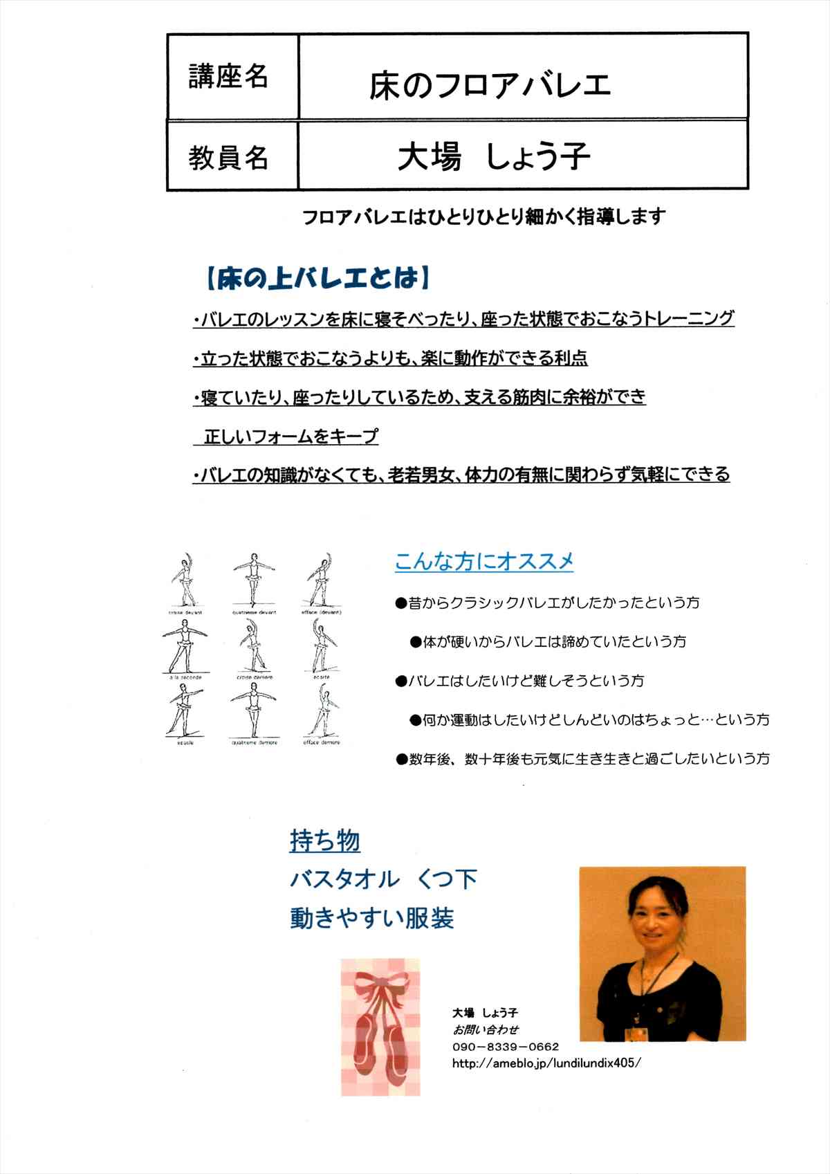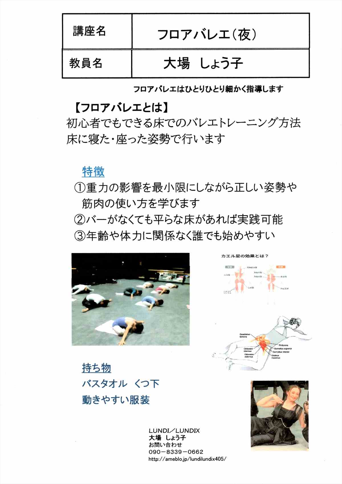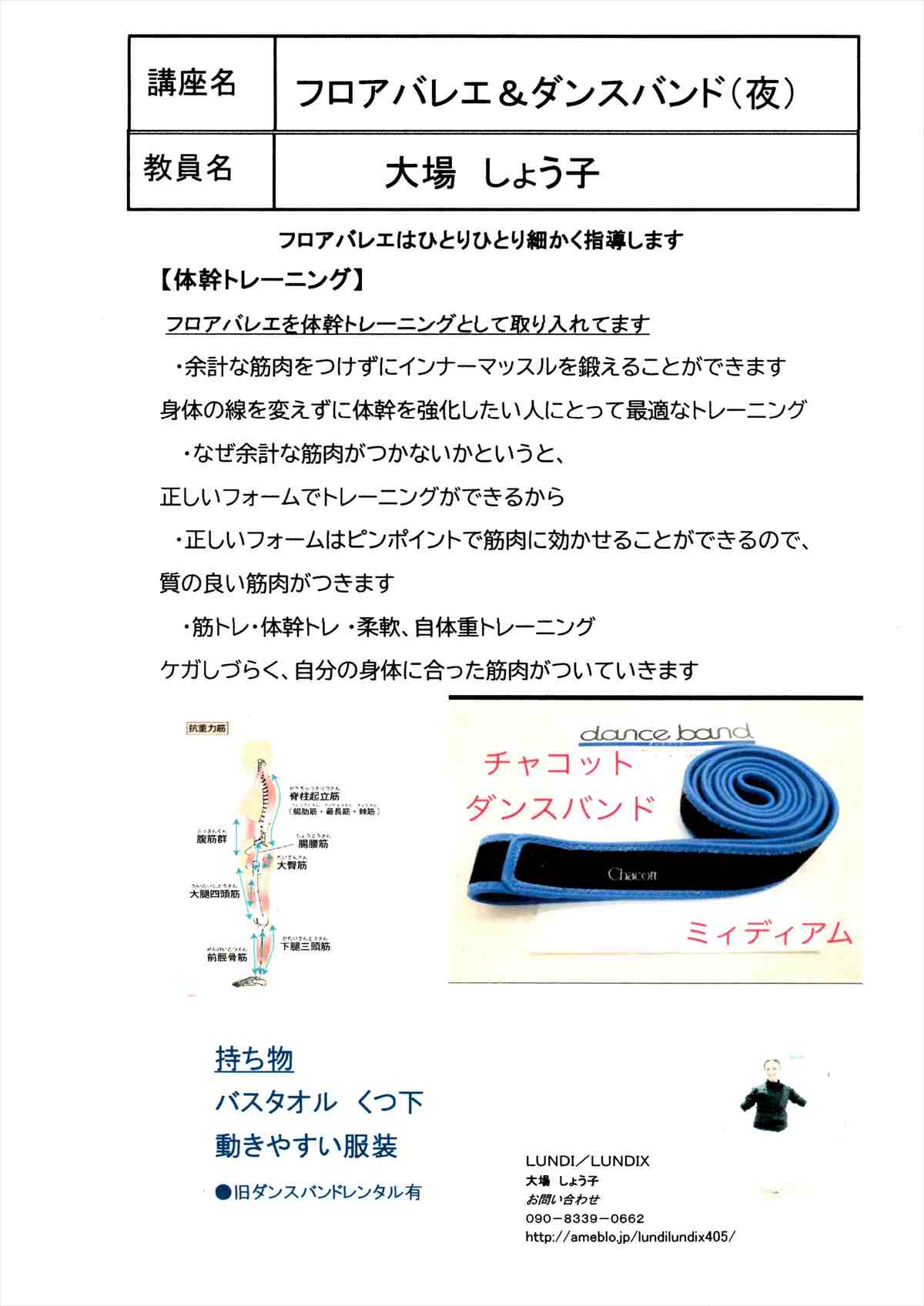 | 142 | フロアバレエ&ダンスバンド(夜) | 大場しょう子 | 4/10・5/8・6/12・7/10・9/11 | 金 | 19:15~20:45 | 芸劇 | 5 | ABC | ¥1,000 | 12 |