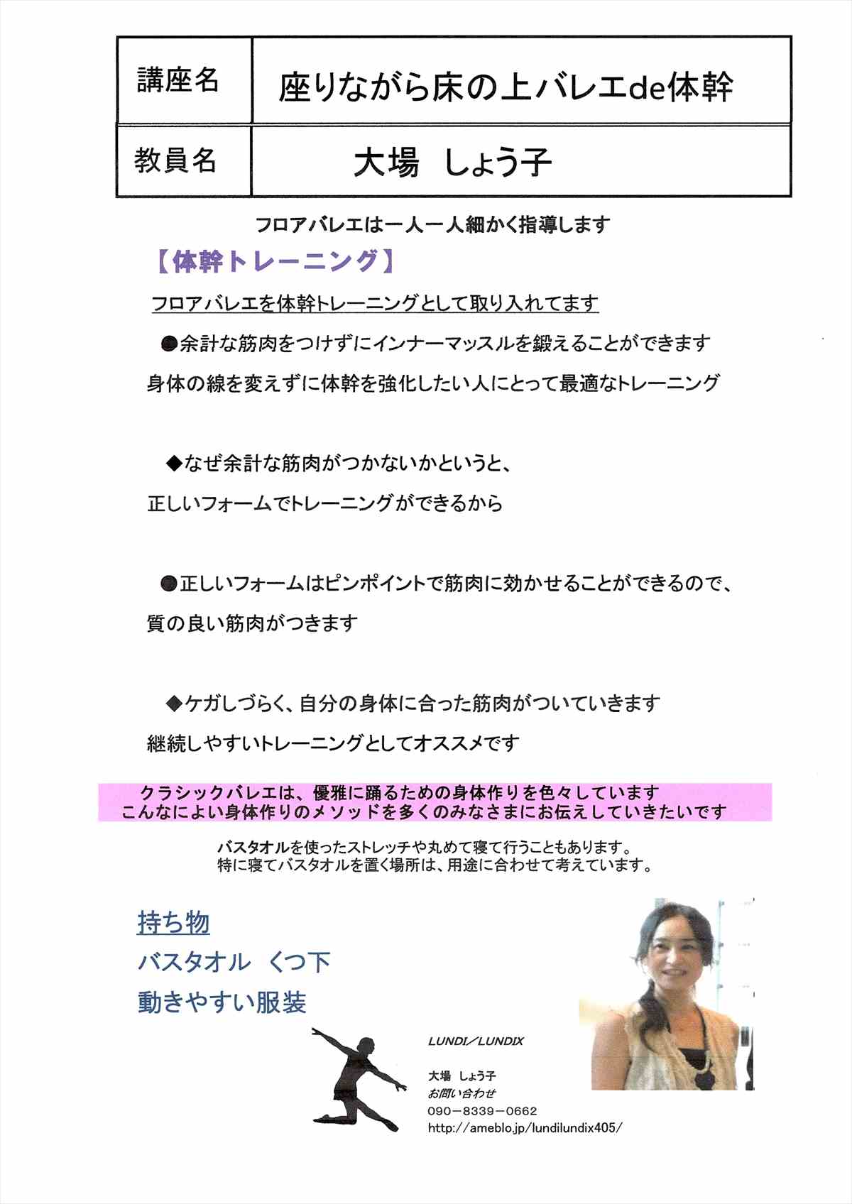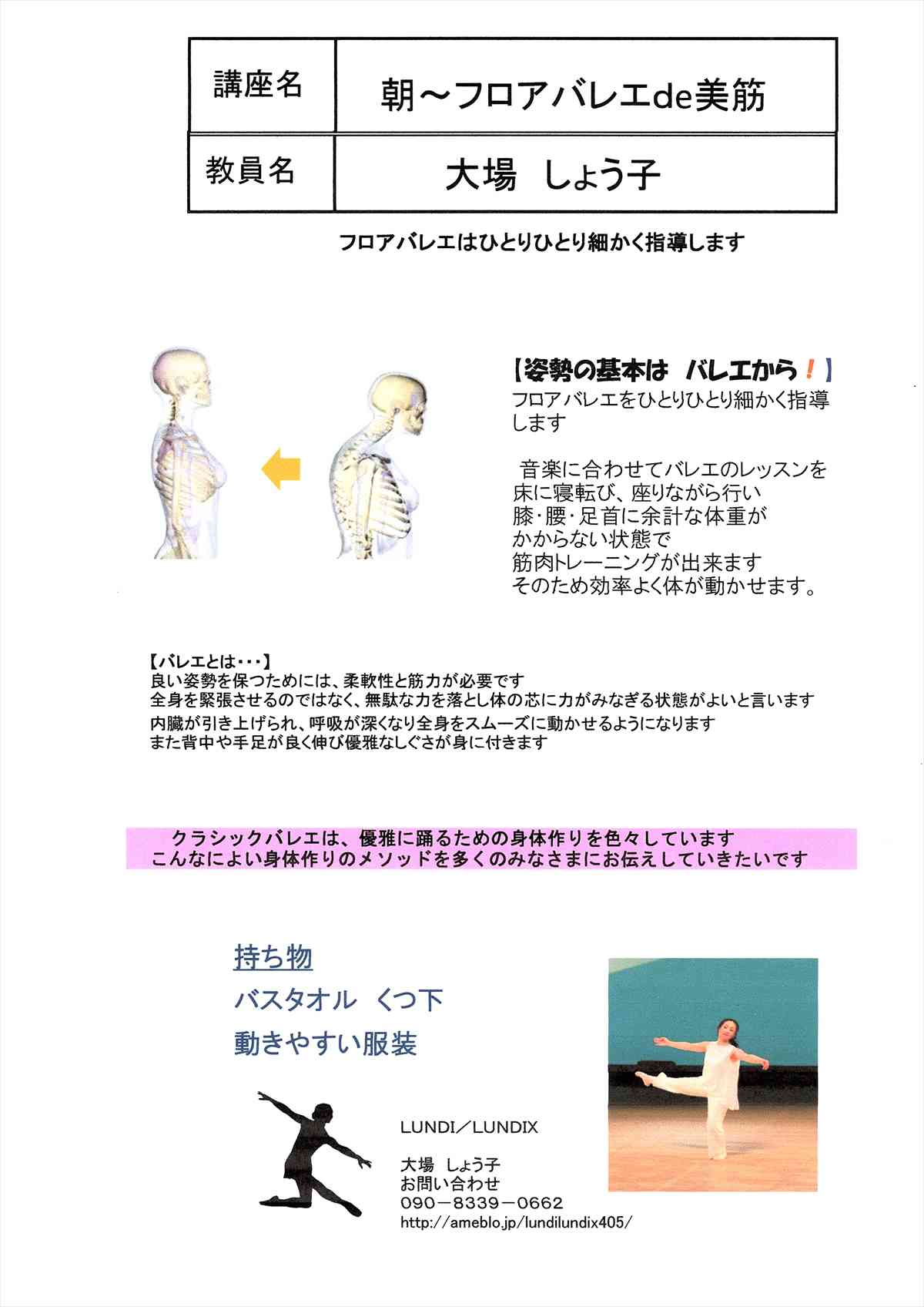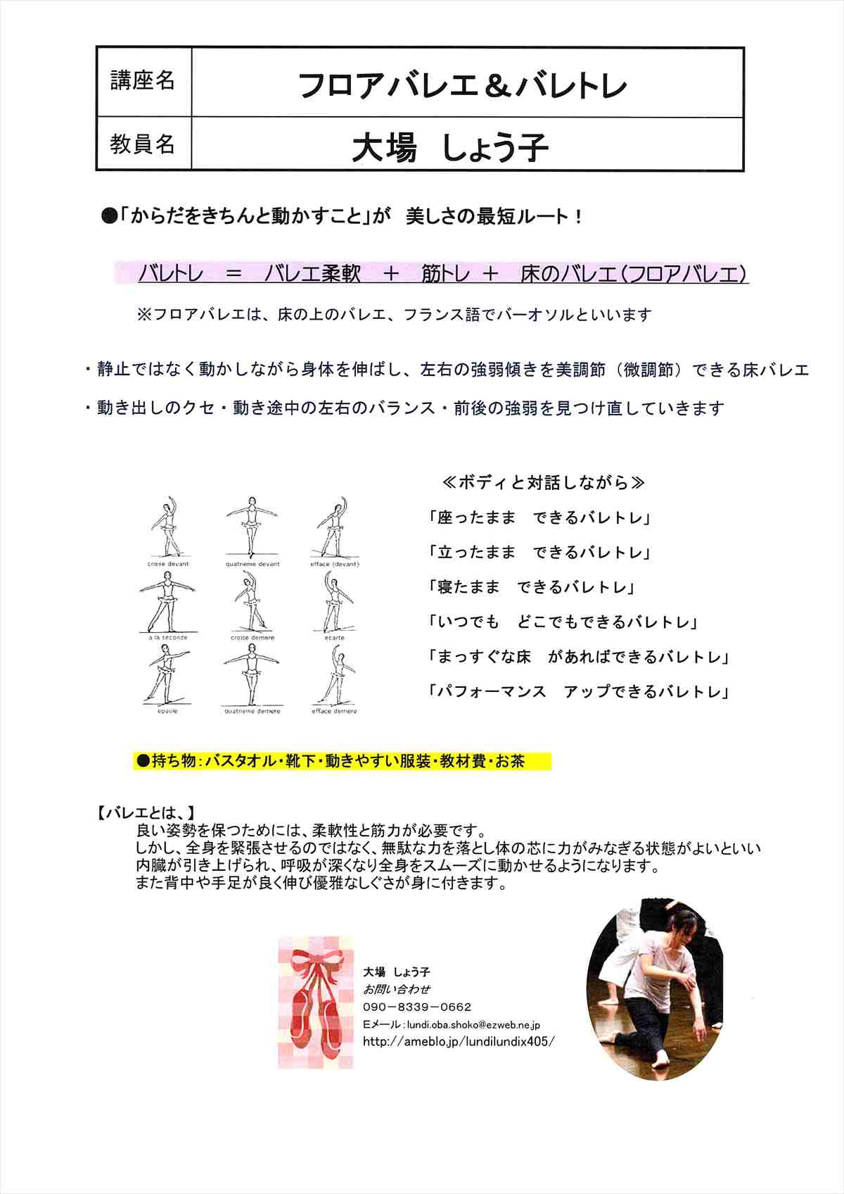 | 142 | フロアバレエ&ダンスバンド(夜) | 大場しょう子 | 4/10・5/8・6/12・7/10・9/11 | 金 | 19:15~20:45 | 芸劇 | 5 | ABC | ¥1,000 | 12 |
