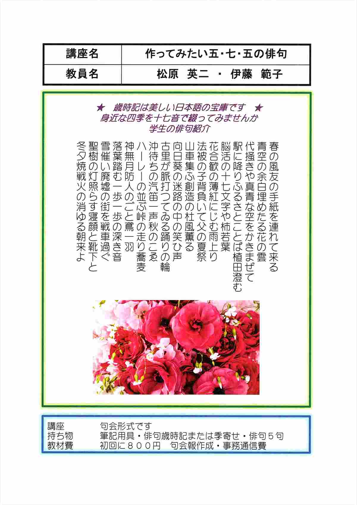 | 145 | 作ってみたい五・七・五の俳句 | 松原英二 伊藤範子 | 4/25・5/23・6/27・7/25・8/22 | 土 | 13:30~15:30 | 横図 | 5 | ABC | ¥800 | 18 |