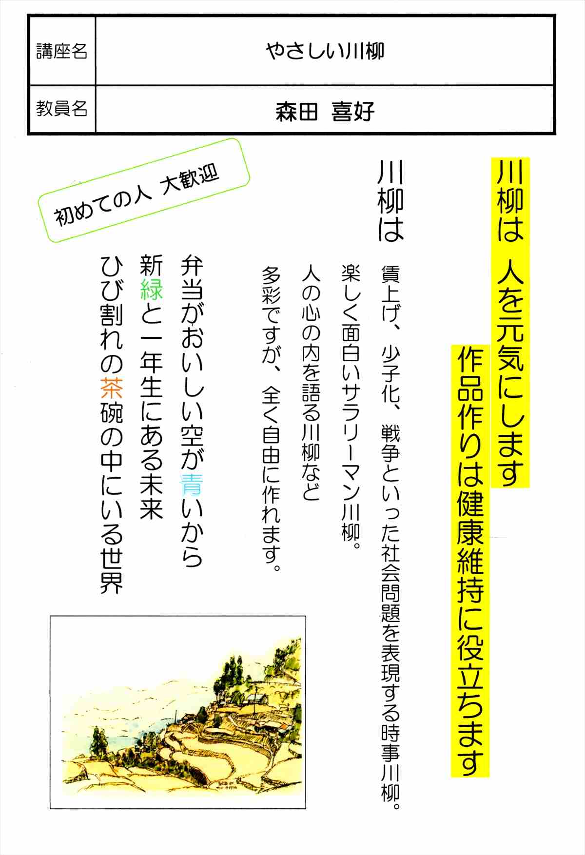| 146 | やさしい川柳 | 森田喜好 | 4/7・4/21・5/19・6/2・6/16・7/7・7/28・8/18・9/1・9/15 | 火 | 10:00~11:30 | 芸劇 | 10 | ABC | ¥2,000 | 18 |