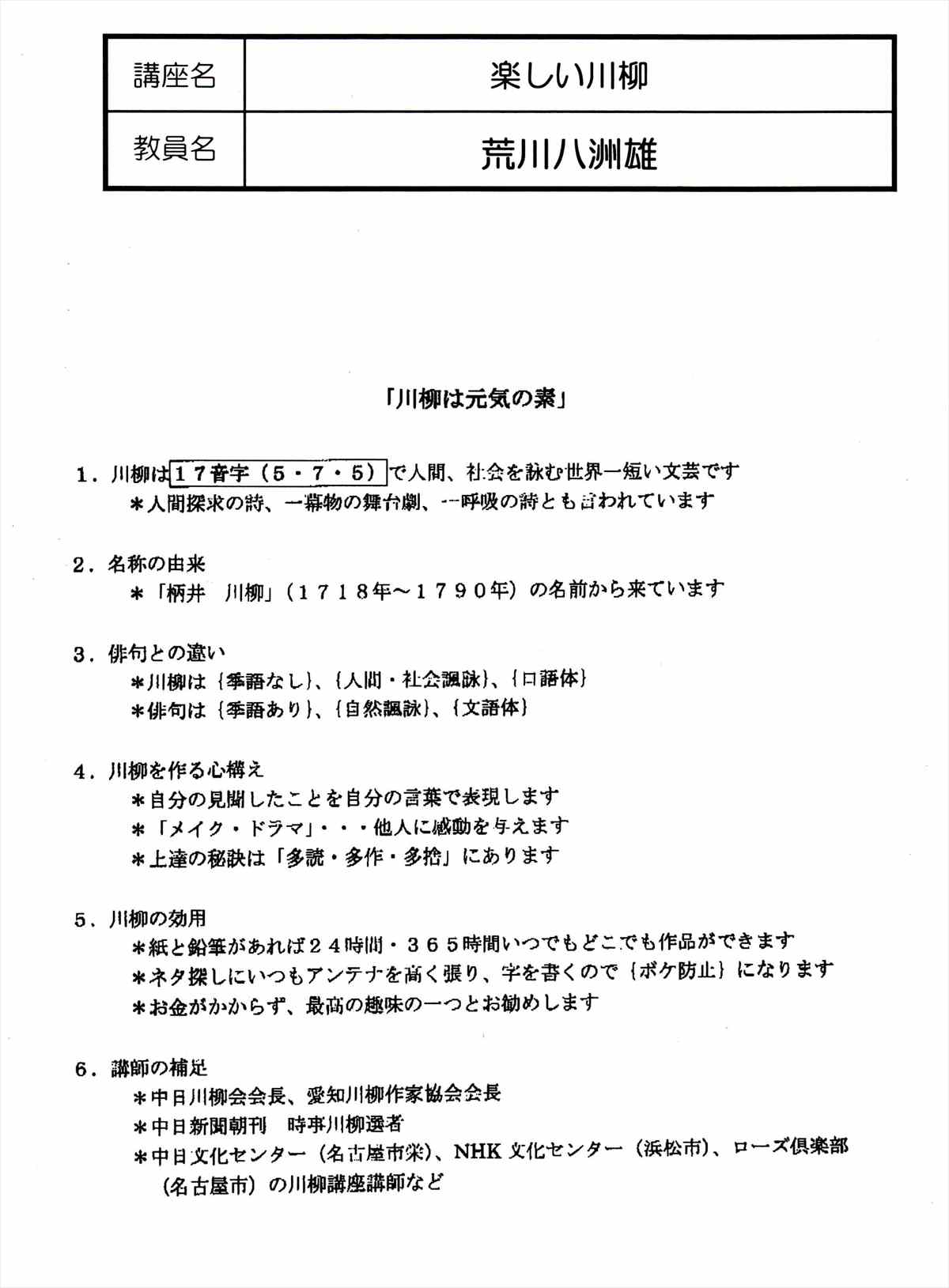 | 147 | 楽しい川柳 | 荒川八洲雄 | 4/6・5/18・6/15・7/6・9/7 | 月 | 13:00~14:30 | し村 | 5 | ABC | ¥500 | 20 |