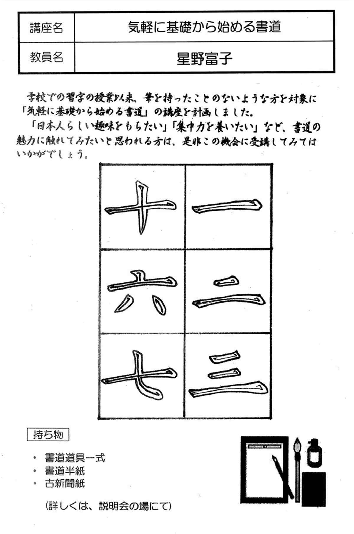 | 148 | 気軽に基礎から始める書道 | 星野富子 | 4/8・4/22・5/13・5/27・6/10・6/24・7/8・7/22・8/26・9/9 | 水 | 13:30~15:00 | 上公 | 10 | ABC | ¥1,000 | 20 |