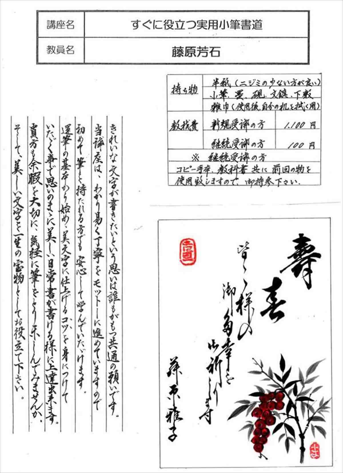 | 150 | すぐに役立つ実用小筆書道 | 藤原芳石 | 4/15・5/20・6/3・6/17・7/1 | 水 | 10:00~11:30 | 勤セ | 5 | ABC | ¥1,100 |