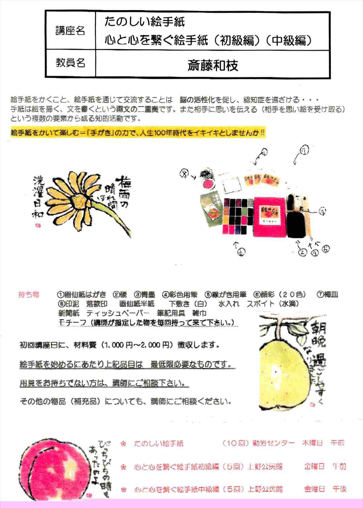 | 152 | 心と心を繋ぐ絵手紙(初級編) | 斎藤和枝 | 5/1・6/5・7/3・8/7・9/4 | 金 | 10:00~11:45 | 上公 | 5 | ABC | ¥1,000 | 20 |
