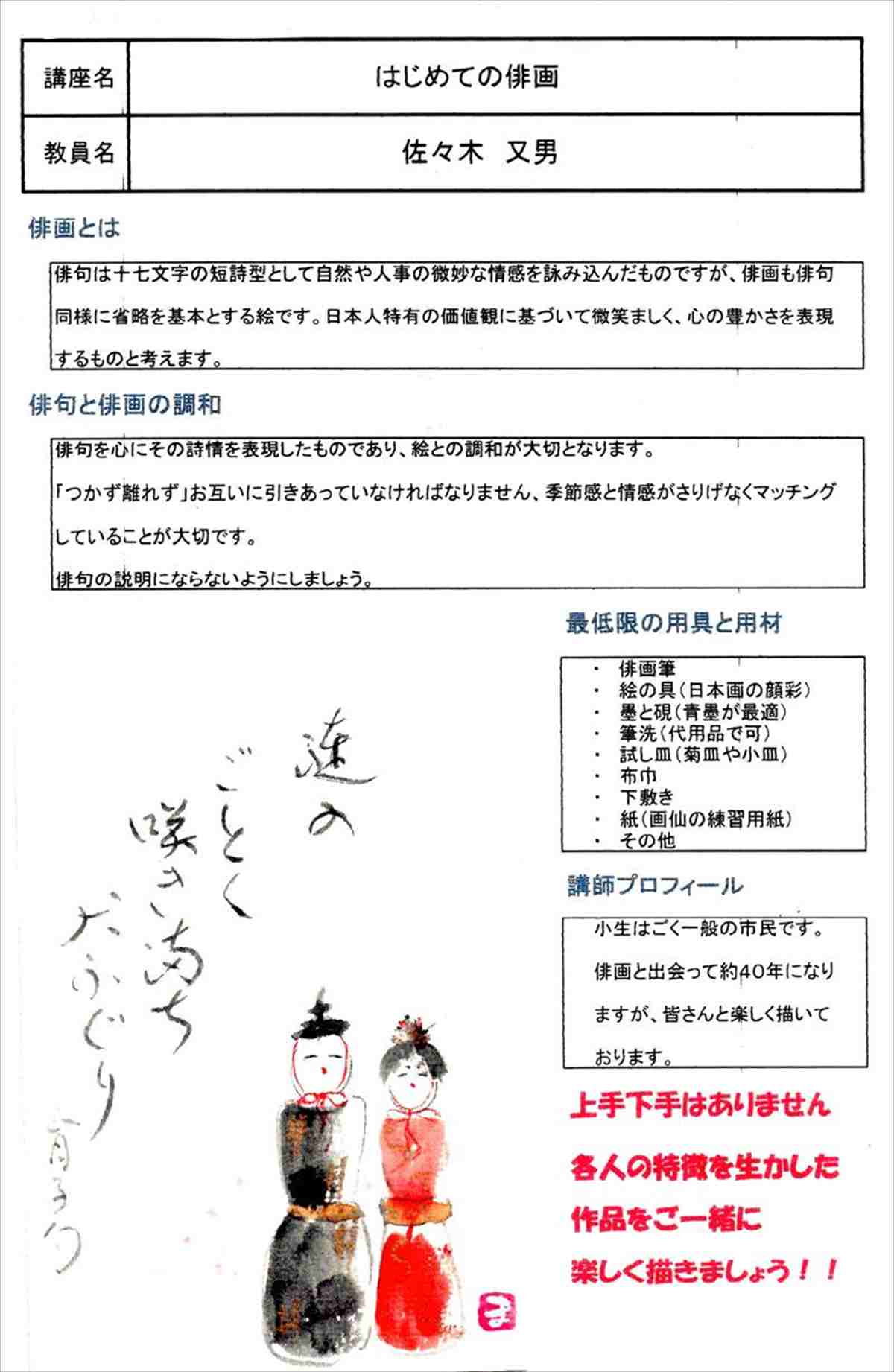 | 154 | はじめての俳画 | 佐々木又男 | 4/15・5/20・6/17・7/15・8/19 | 水 | 9:30~11:00 | 芸劇 | 5 | ABC | ¥250 | 10 |