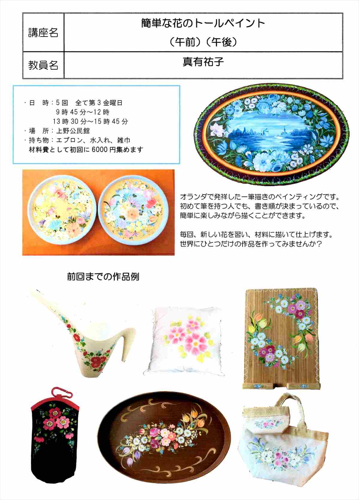 | 157 | 簡単な花のトールペイント(午前) | 真有祐子 | 4/17・5/15・6/19・7/17・9/18 | 金 | 9:45~12:00 | 上公 | 5 | ABC | ¥6,000 | 12 |