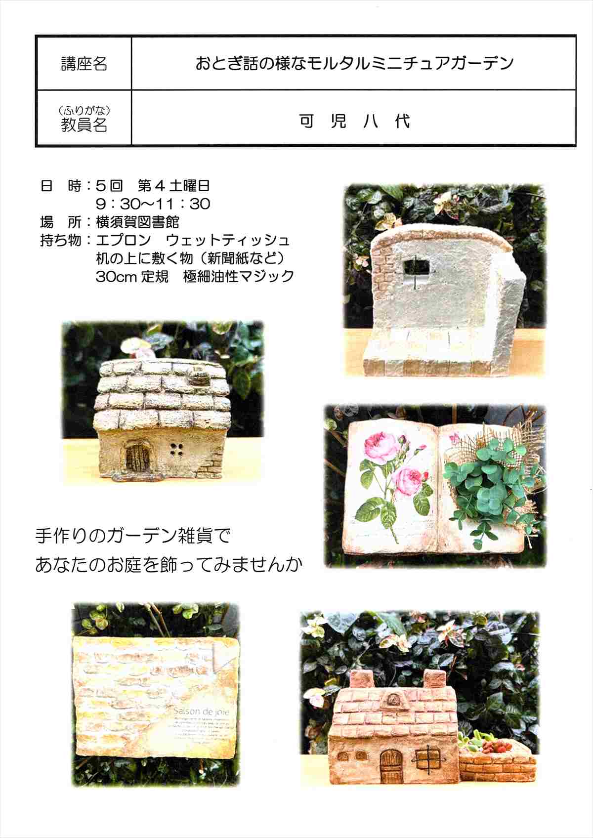 | 160 | おとぎ話の様なモルタルミニチュアガーデン | 可児八代 | 4/25・5/23・6/27・7/25・8/22 | 土 | 9:30~11:30 | 横図 | 5 | AB | ¥4,500 | 20 |