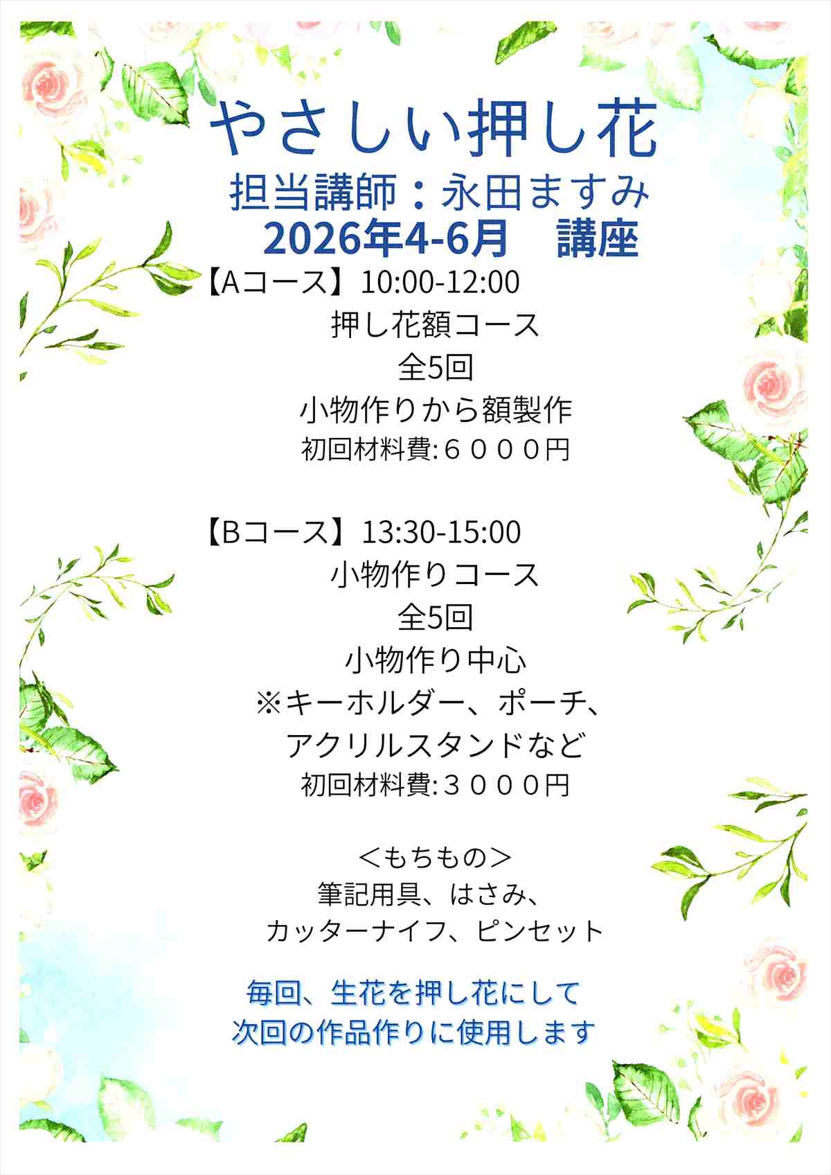 | 162 | やさしい押し花 B | 永田ますみ | 4/27・5/11・5/25・6/8・6/22 | 月 | 13:30~15:00 | し村 | 5 | ABC | ¥3,000 | 10 |