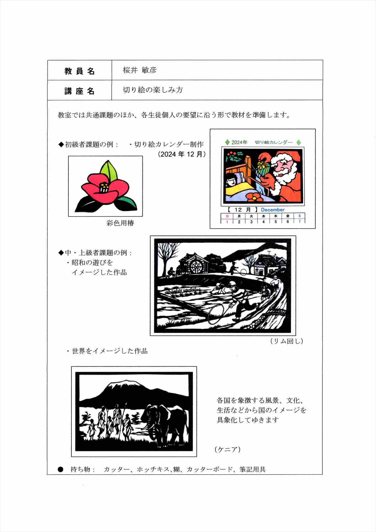 | 163 | 切り絵の楽しみ方 | 桜井敏彦 | 4/7・4/21・5/19・6/2・6/16・7/7・8/4・8/18・9/1・9/15 | 火 | 10:00~11:30 | 横図 | 10 | ABC | ¥500 | 20 |