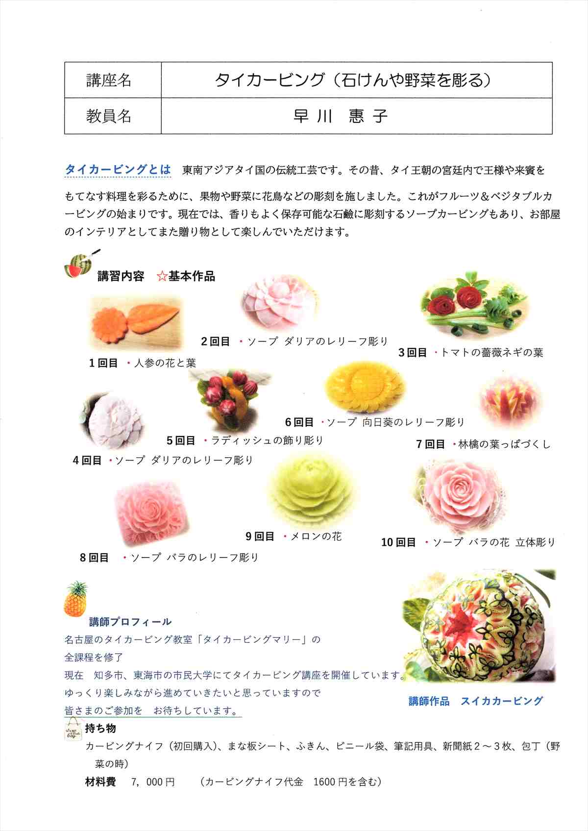 | 165 | タイカービング(石けんや野菜を彫る) | 早川惠子 | 4/15・5/20・6/3・6/17・7/1・7/15・8/5・8/19・9/2・9/16 | 水 | 13:30~15:30 | 横図 | 10 | ABC | ¥7,000 | 15 |