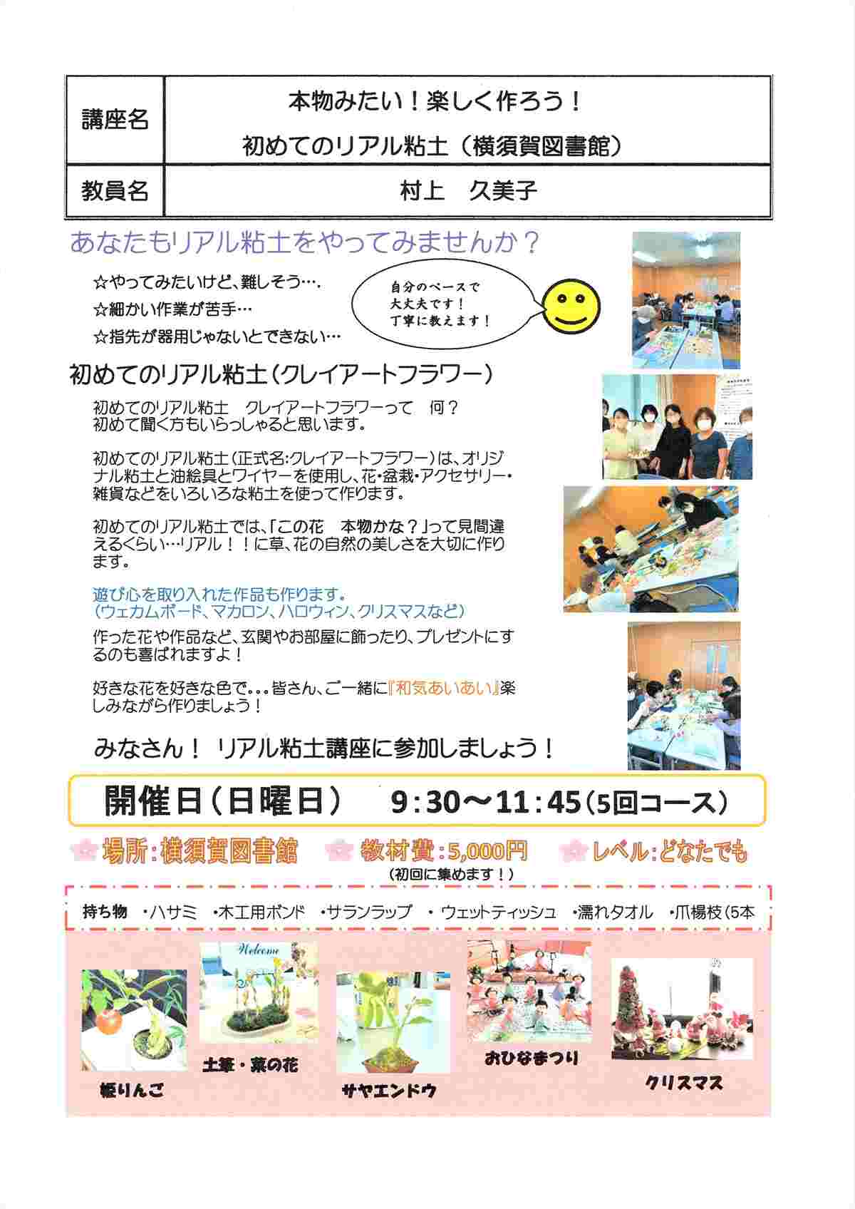 | 166 | 本物みたい!楽しく作ろう!初めてのリアル粘土(上公) | 村上久美子 | 4/19・5/17・6/21・7/19・8/16 | 日 | 9:30~11:45 | 上公 | 5 | ABC | ¥5,000 | 10 |