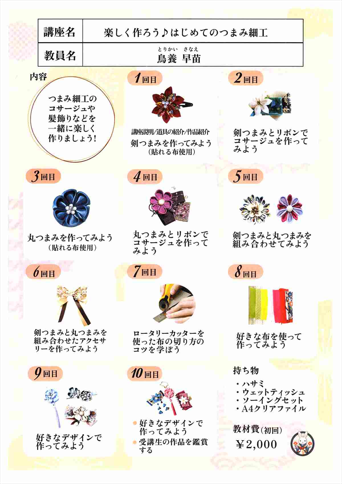 | 168 | 楽しく作ろう♪はじめてのつまみ細工 | 鳥養早苗 | 4/17・5/15・5/29・6/5・6/19・7/3・7/17・8/7・8/21・9/4 | 金 | 18:30~20:30 | 横図 | 10 | AB | ¥2,000 | 10 |
