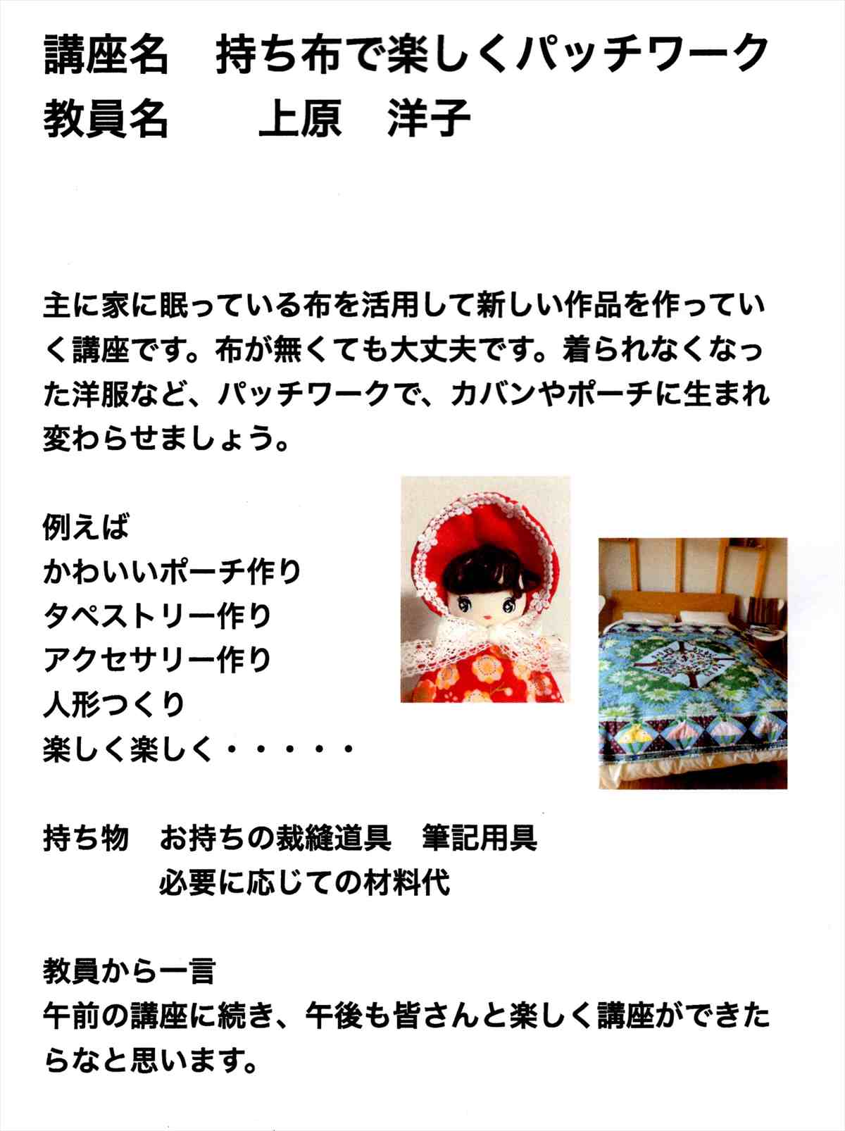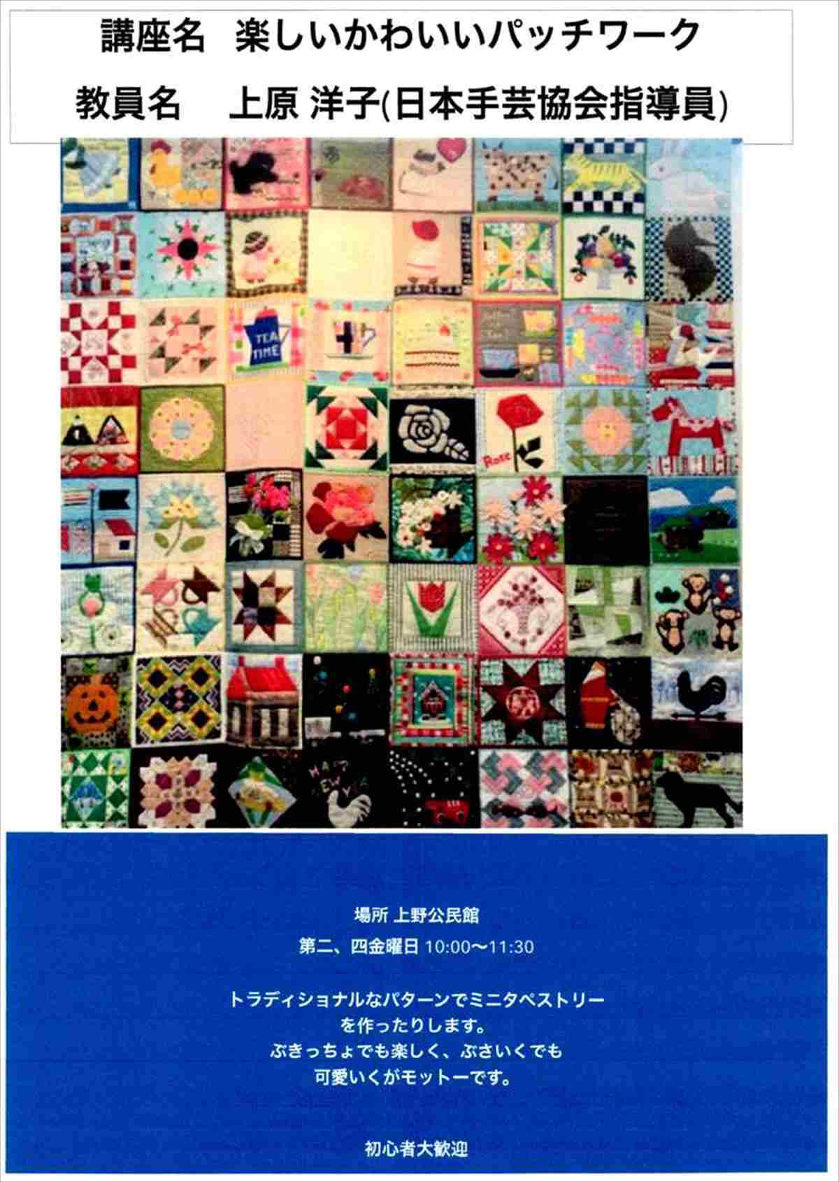 | 170 | 楽しいかわいいパッチワーク | 上原洋子 | 4/10・4/24・5/8・5/22・6/12・6/26・7/10・7/24・8/28・9/11 | 金 | 10:00~11:30 | 上公 | 10 | ABC | ¥10,000 | 24 |