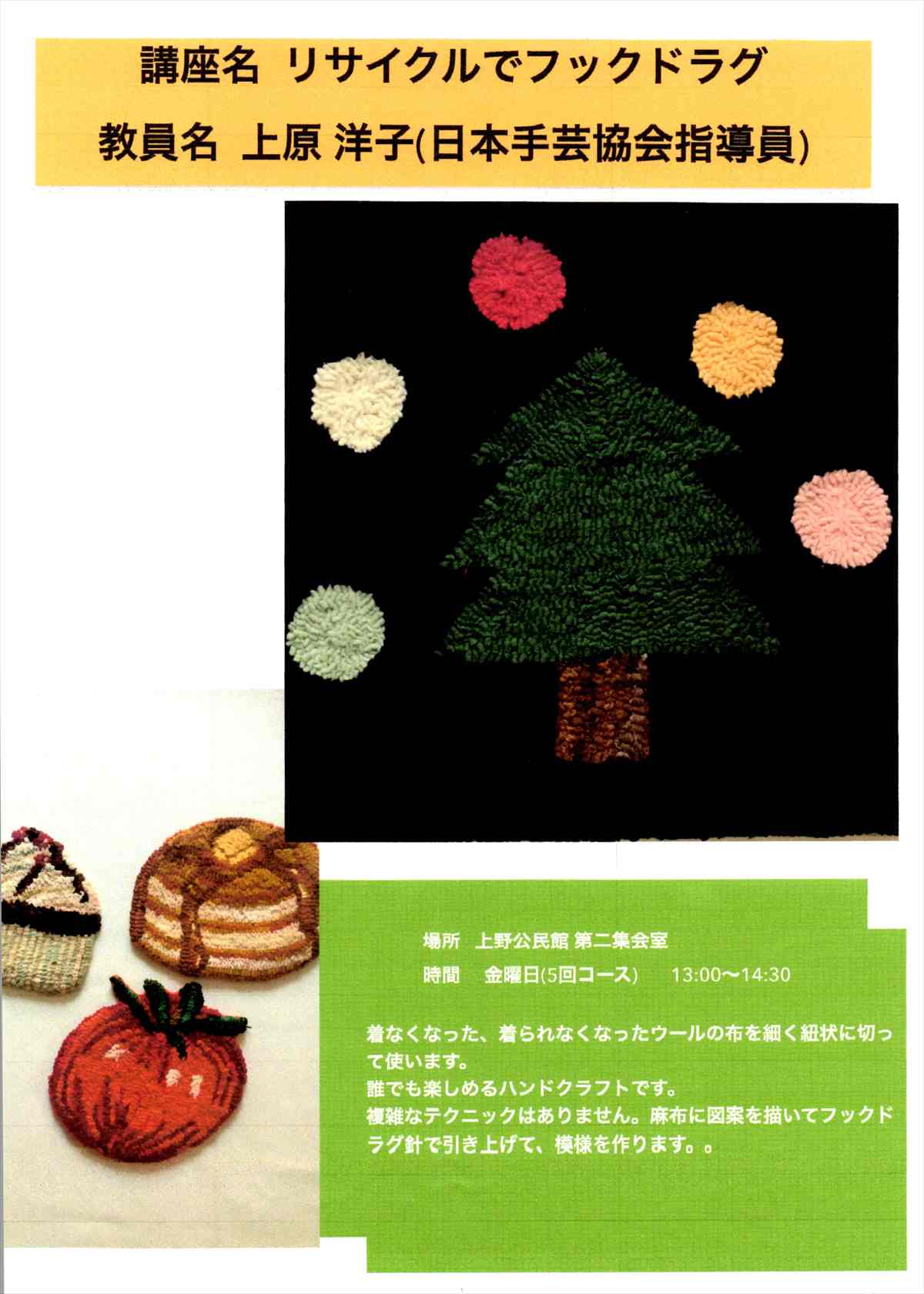 | 172 | リサイクルでフックドラグ | 上原洋子 | 4/10・5/8・6/12・7/10・9/11 | 金 | 13:00~14:30 | 上公 | 5 | ABC | ¥5,000 | 20 |