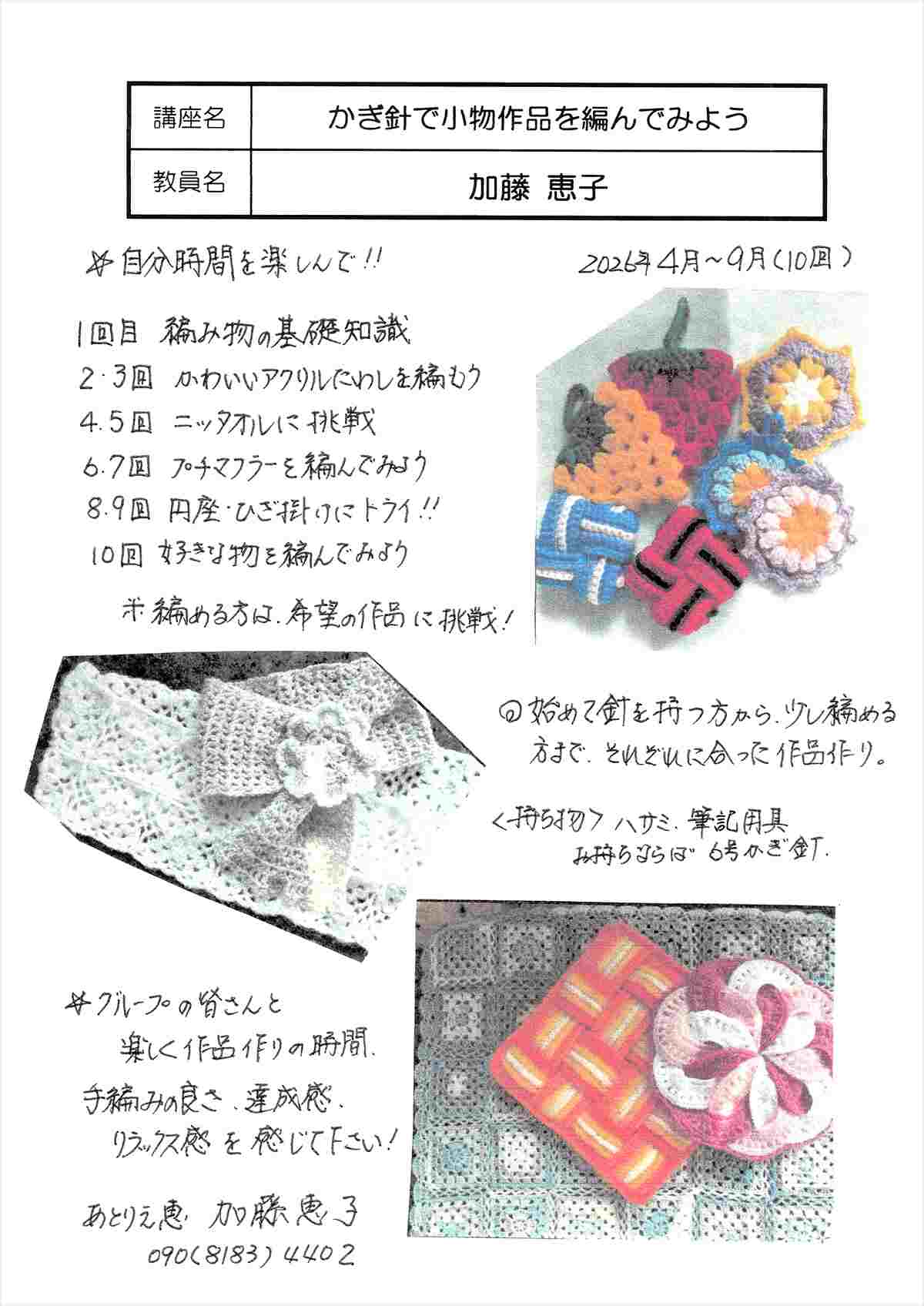 | 174 | かぎ針で小物作品を編んでみよう | 加藤恵子 | 4/10・4/24・5/8・5/22・6/12・6/26・7/10・7/24・8/28・9/11 | 金 | 10:00~11:30 | 横図 | 10 | AB | ¥4,000 | 10 |