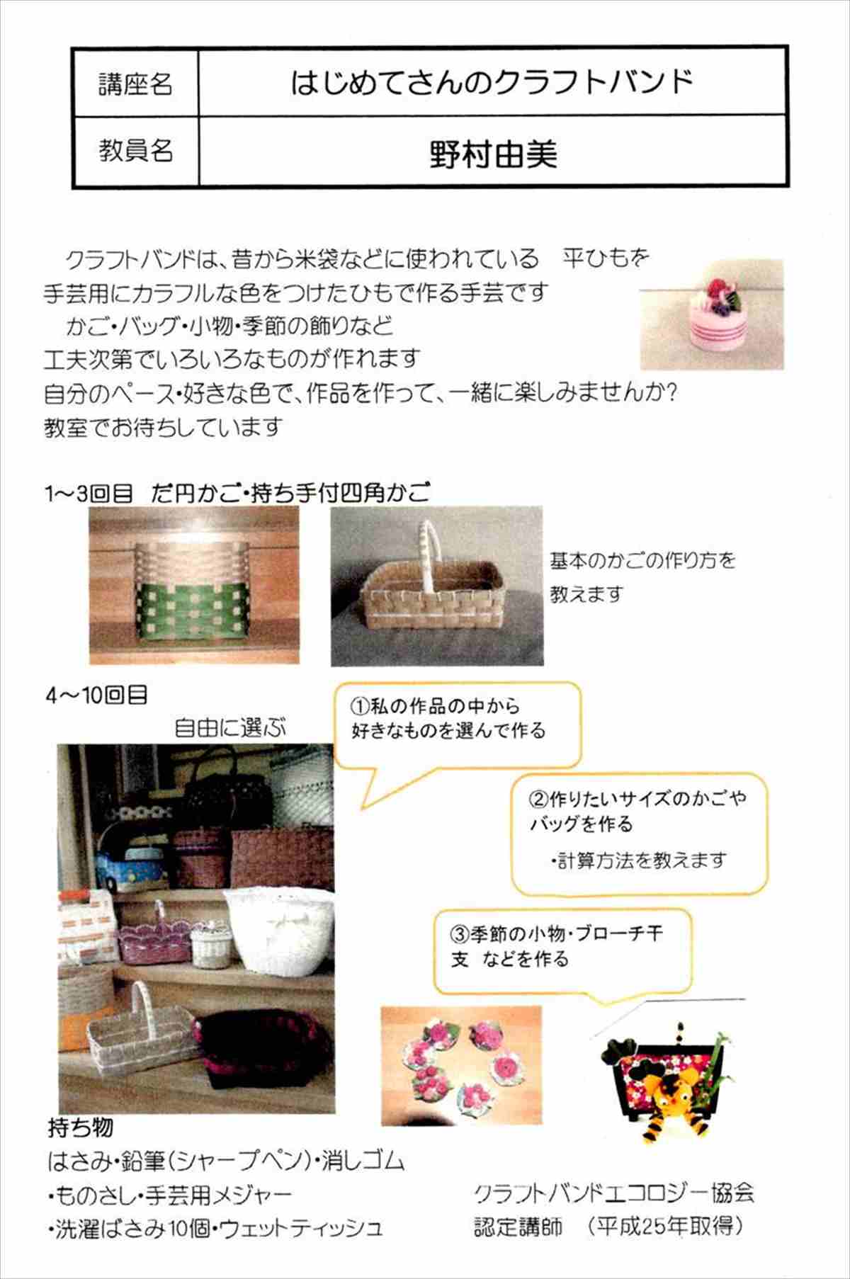 | 175 | はじめてさんのクラフトバンド | 野村由美 | 4/16・5/7・5/21・6/4・6/18・7/2・7/16・8/6・8/20・9/3 | 木 | 14:00~15:45 | 芸劇 | 10 | AB | ¥3,500 | 12 |