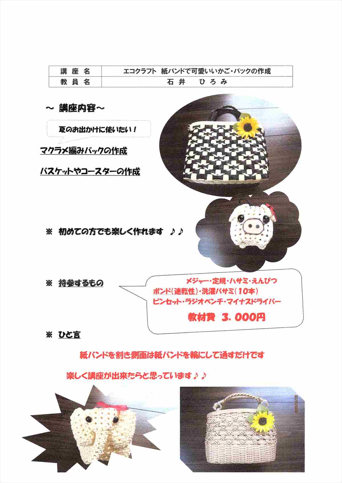 | 176 | エコクラフト 紙バンドで可愛いカゴ・バッグ作り(午前) | 石井ひろみ | 4/10・4/24・5/8・5/22・6/12・6/26・7/10・7/24・8/28・9/11 | 金 | 10:00~11:30 | 上公 | 10 | AB | ¥3,000 | 20 |