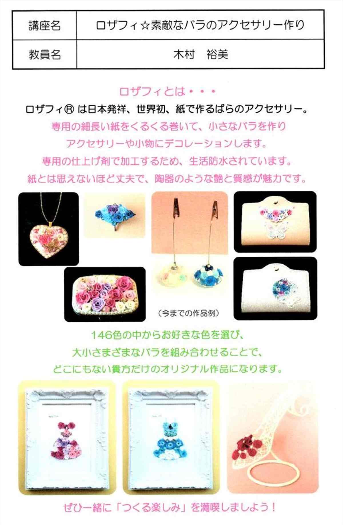 | 178 | ロザフィ☆素敵なバラのアクセサリー作り | 木村裕美 | 4/21・5/19・6/16・7/7・9/15 | 火 | 9:45~11:45 | 上公 | 5 | AB | ¥4,500 | 10 |