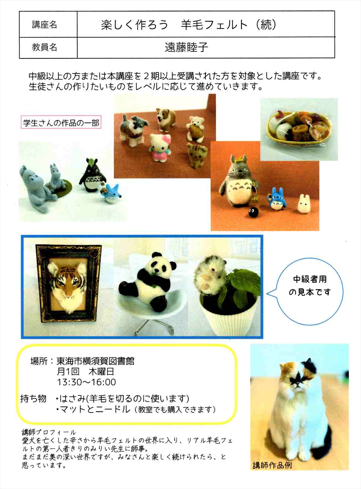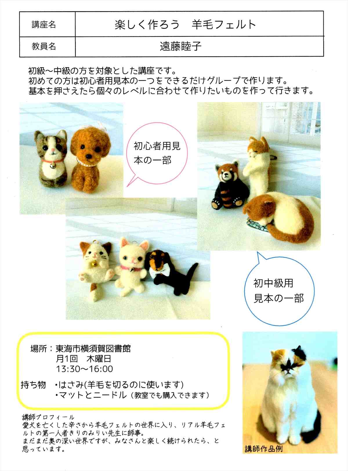 | 181 | 楽しく作ろう 羊毛フェルト | 遠藤睦子 | 4/16・5/21・6/18・7/16・8/20 | 木 | 13:30~16:00 | 横図 | 5 | ABC | ¥1,000 | 15 |