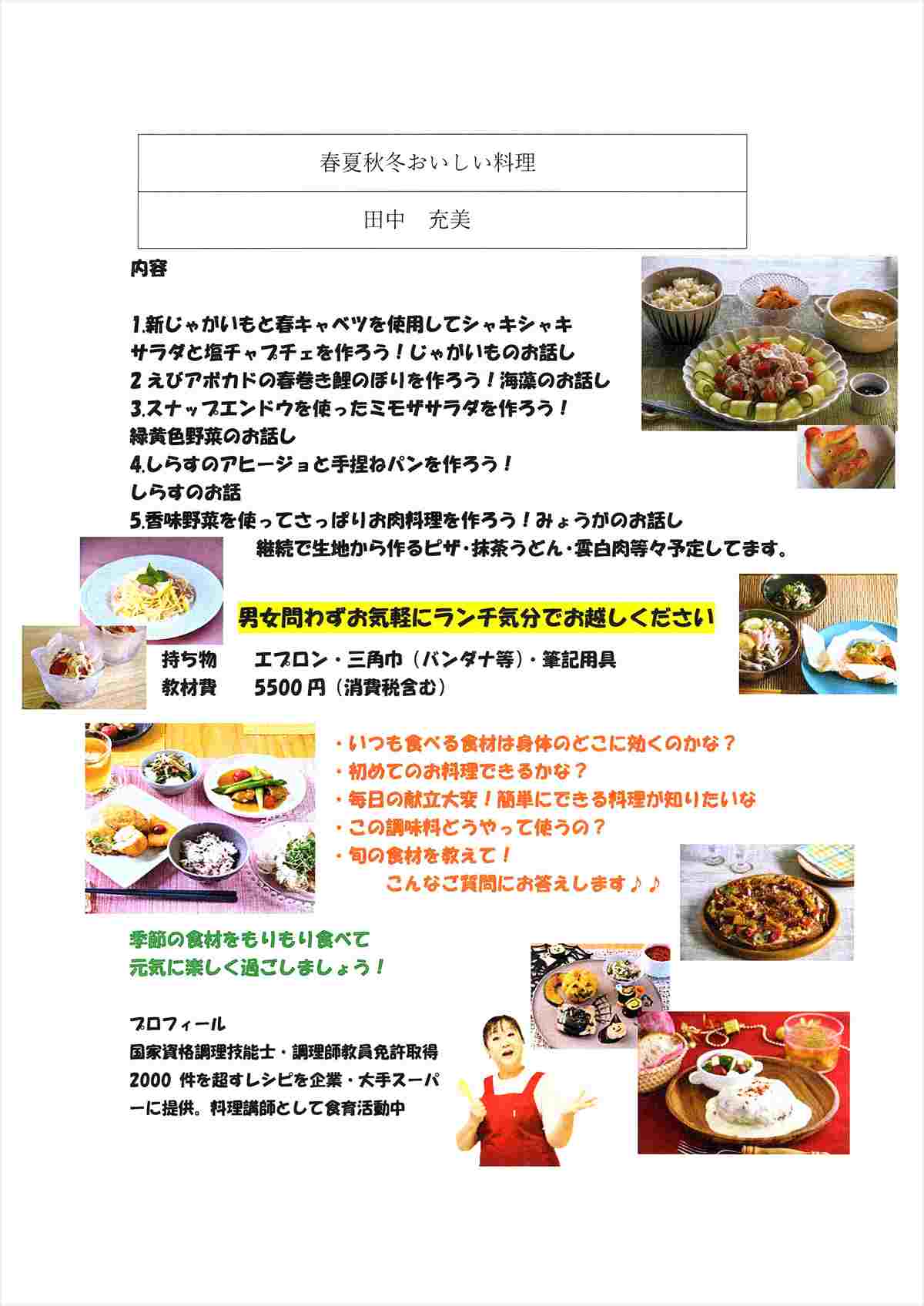 | ★183 | 春夏秋冬おいしい料理 | 田中充美 | 4/10・4/24・5/8・5/22・6/12 | 金 | 10:00~13:00 | 上公 | 5 | AB | ¥5,500 | 20 |