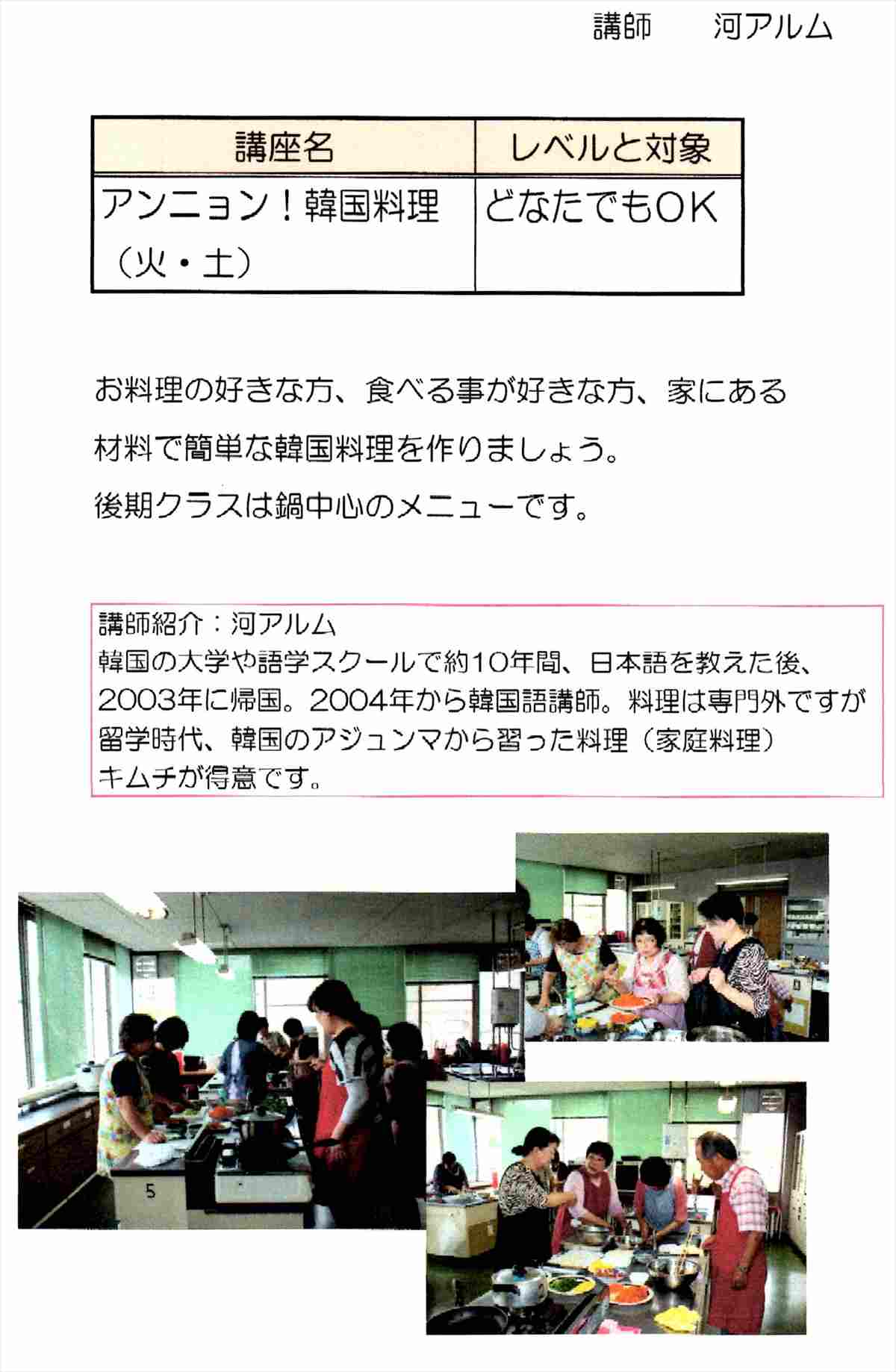| 185 | アンニョン!韓国料理(土) | 河 アルム | 4/25・5/23・6/13・7/11・8/8 | 土 | 9:45~12:00 | 上公 | 5 | ABC | ¥5,500 | 19 |