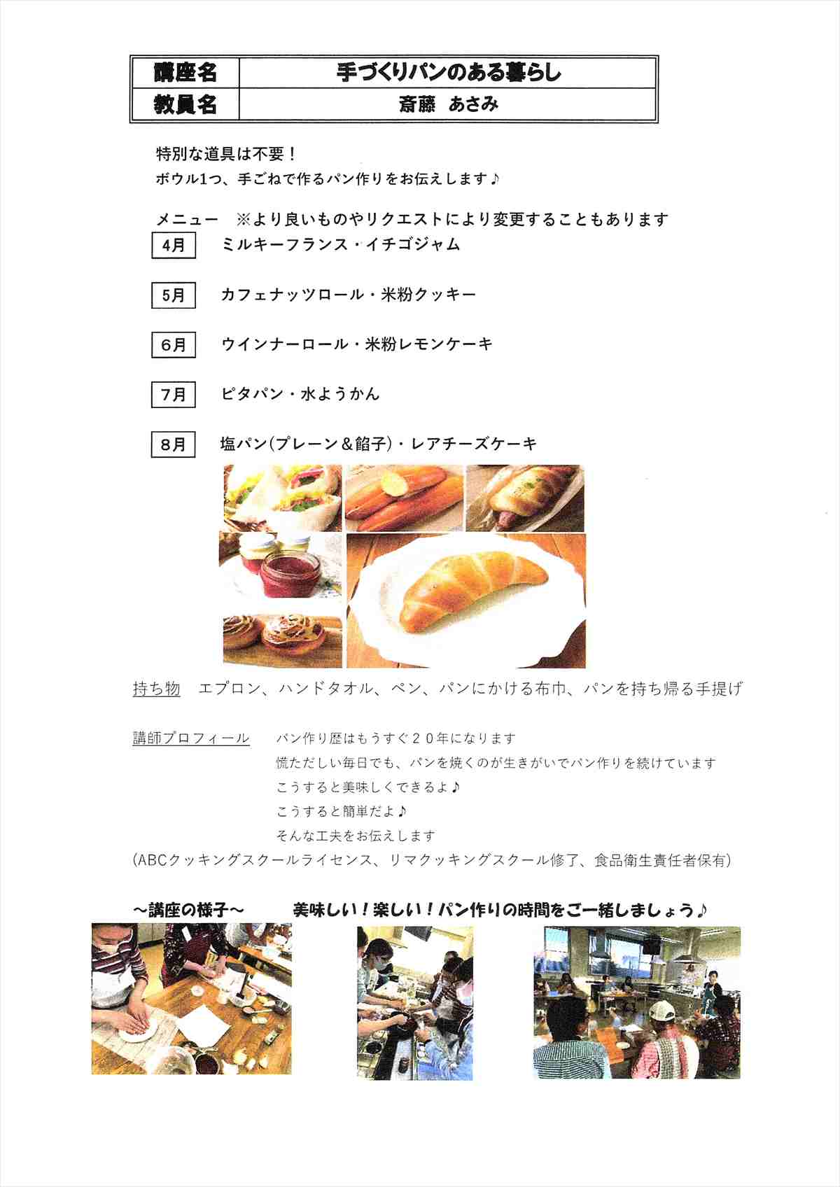 | 186 | 手づくりパンのある暮らし | 斎藤あさみ | 4/18・5/16・6/20・7/18・9/19 | 土 | 13:30~16:30 | 富公 | 5 | AB | ¥13,000 | 12 |