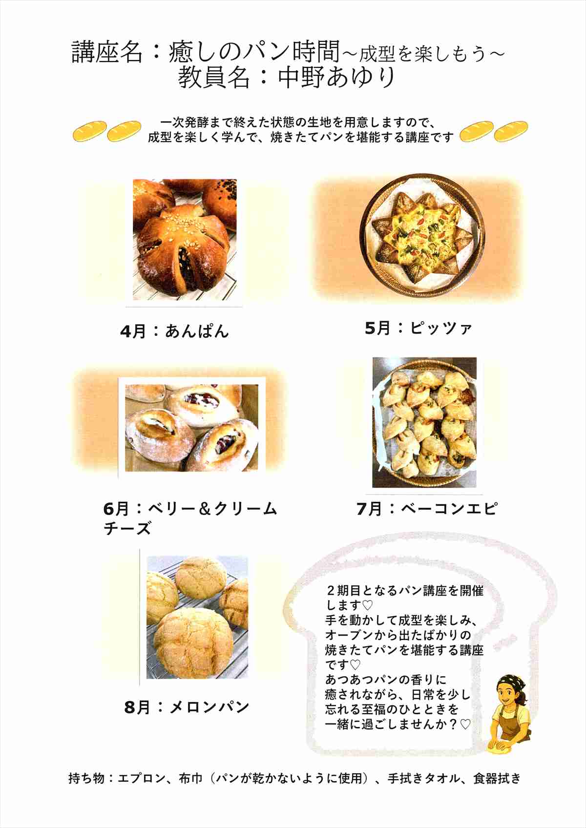 | 187 | 癒しのパン時間~成型を楽しもう~ | 中野あゆり | 4/23・5/28・6/25・7/23・8/6 | 木 | 9:50~11:50 | 富公 | 5 | AB | ¥11,000 | 10 |