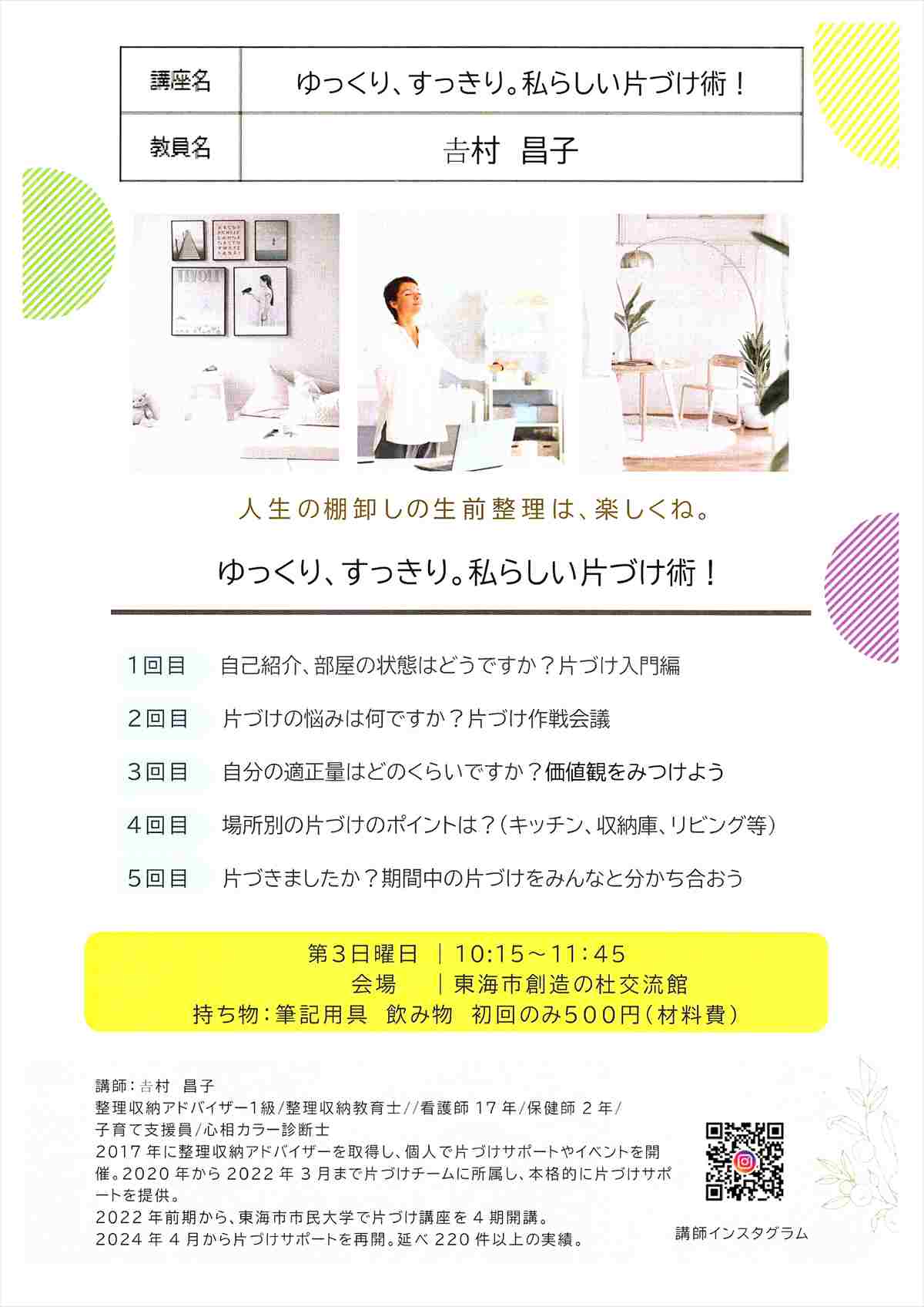 | 188 | ゆっくり、すっきり。私らしい片づけ術! | 𠮷村昌子 | 4/19・5/17・6/21・7/19・9/13 | 日 | 10:15~11:45 | 創杜 | 5 | AB | ¥500 | 20 |