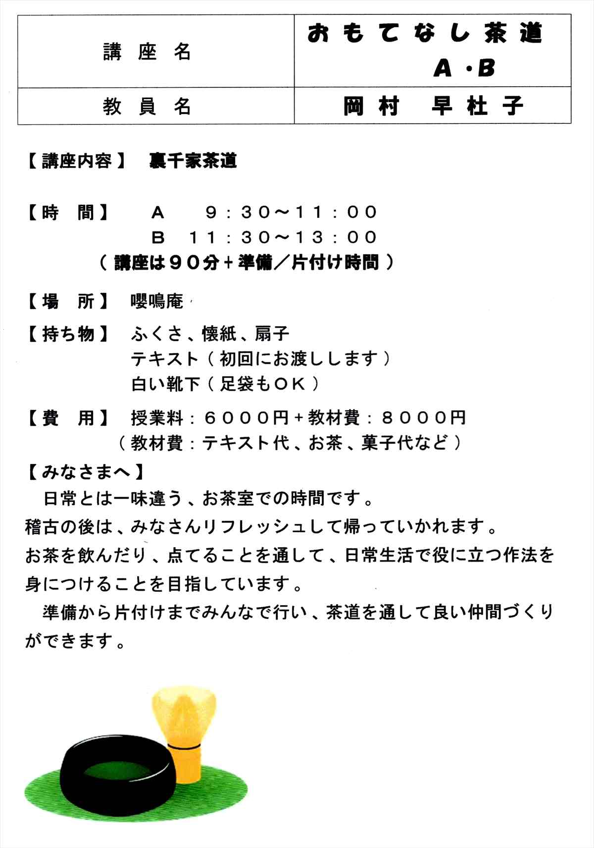 | 190 | おもてなし茶道 A | 岡村早杜子 | 4/24・5/8・5/22・6/12・6/26・7/10・7/24・8/28・9/11・9/25 | 金 | 9:30~11:00 | 嚶鳴庵 | 10 | ABC | ¥8,000 | 17 |