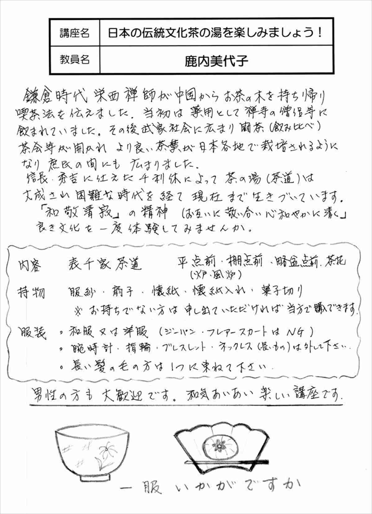 | 192 | 日本の伝統文化 茶の湯を楽しみましょう! | 鹿内美代子 | 4/9・4/23・5/14・5/28・6/11・6/25・7/9・7/23・8/27・9/10 | 木 | 13:30~16:00 | 大市 | 10 | ABC | ¥3,000 | 15 |