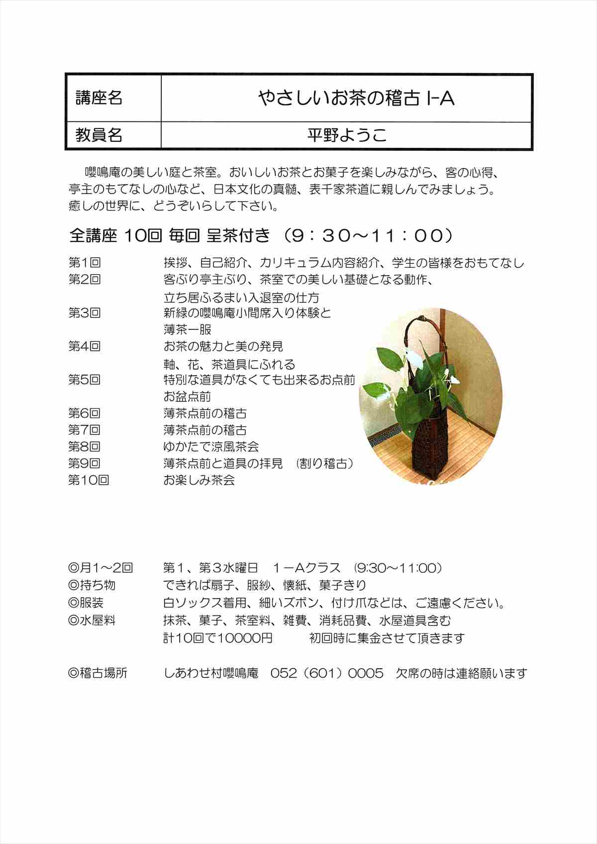 | 193 | やさしいお茶の稽古Ⅰ-A | 平野ようこ | 4/15・5/20・6/3・6/17・7/1・7/15・8/5・8/19・9/2・9/16 | 水 | 9:30~11:00 | 嚶鳴庵 | 10 | ABC | ¥10,000 | 15 |