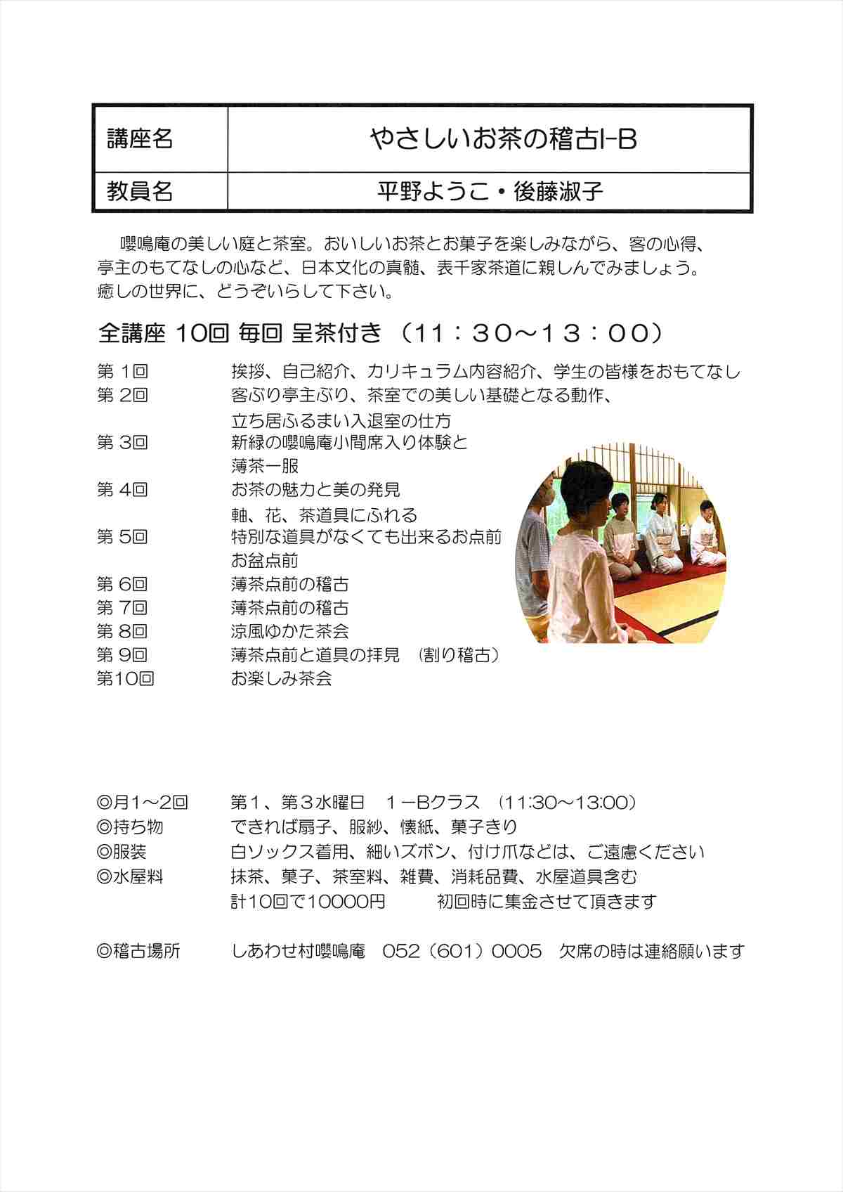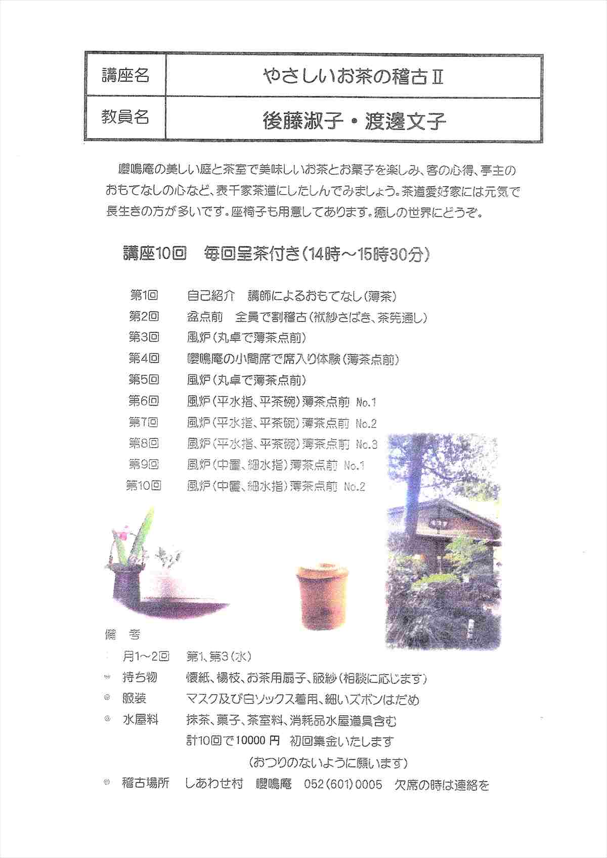| 194 | やさしいお茶の稽古Ⅰ-B | 平野ようこ 後藤淑子 | 4/15・5/20・6/3・6/17・7/1・7/15・8/5・8/19・9/2・9/16 | 水 | 11:30~13:00 | 嚶鳴庵 | 10 | ABC | ¥10,000 | 15 |