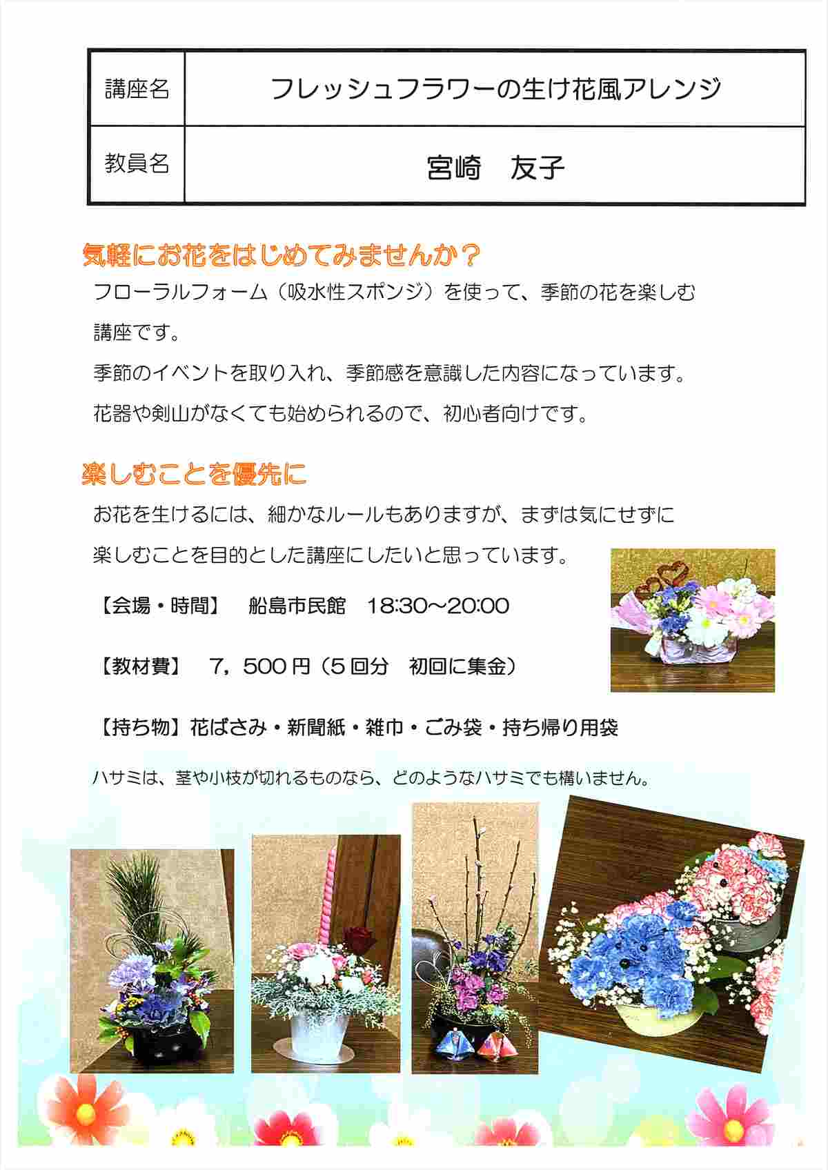 | 196 | フレッシュフラワーの生け花風アレンジ | 宮崎友子 | 4/23・5/28・6/25・7/23・8/27 | 木 | 18:30~20:00 | 船市 | 5 | AB | ¥7,500 | 20 |