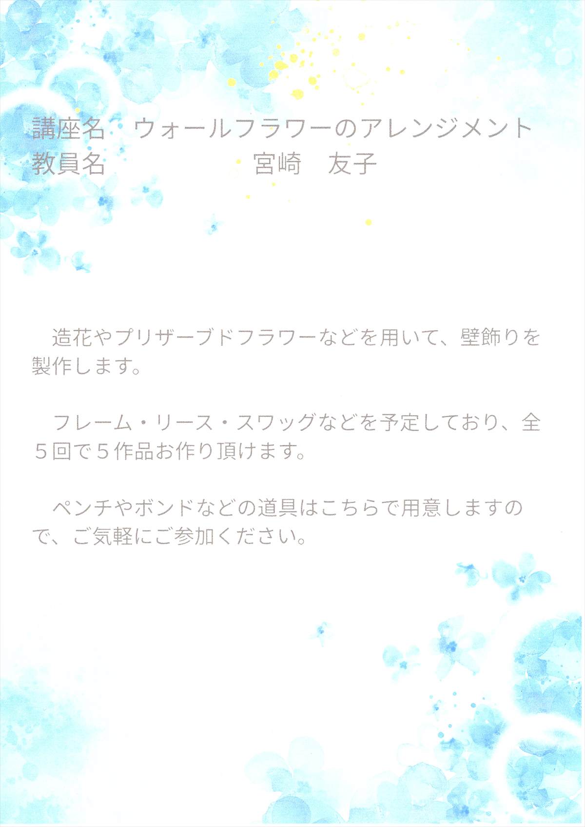 | 198 | ウォールフラワーのアレンジメント | 宮崎友子 | 4/17・5/15・6/19・7/17・8/21 | 金 | 13:30~15:00 | 船市 | 5 | AB | ¥8,500 | 20 |