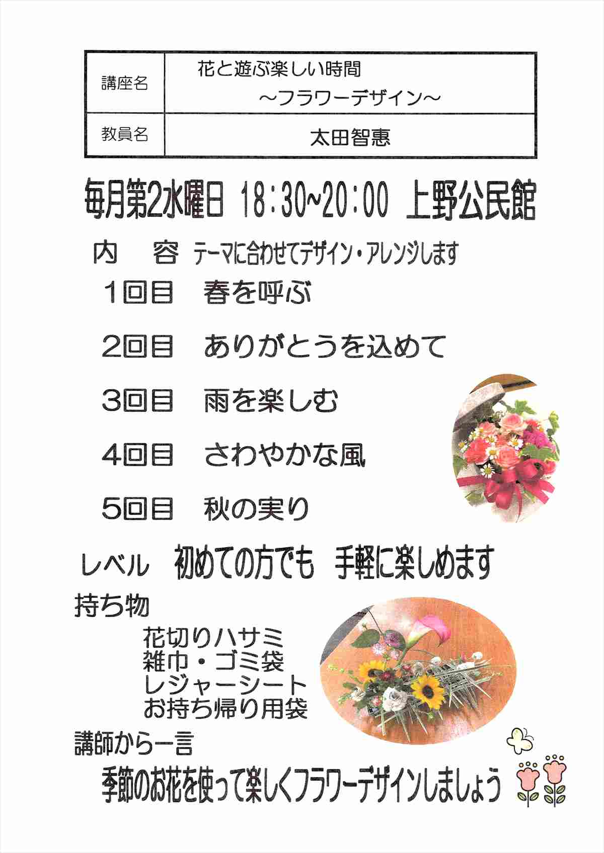 | 199 | 花と遊ぶ楽しい時間 ~フラワーデザイン~ | 太田智惠 | 4/8・5/13・6/10・7/8・9/9 | 水 | 18:30~20:00 | 上公 | 5 | ABC | ¥11,000 | 20 |
